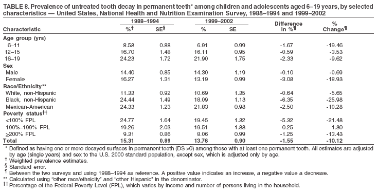Approximately 14% of children and adolescents aged 6--19 years had untreated tooth decay in their permanent teeth (Table 8). Non-Hispanic white children and adolescents had a lower prevalence (10.7%), compared with non-Hispanic black (18.1%) and Mexican-American children and adolescents (21.8%). Children and adolescents from families with incomes >200% of the FPL had a lower prevalence of untreated tooth decay (8.1%), compared with lower income groups (both 19.5%). A trend toward lower prevalence of untreated tooth decay was observed in 1999--2002 compared with 1988--1994, but CIs overlap. The largest absolute reduction was observed among non-Hispanic black children and adolescents (from 24.4% to 18.1%) (Table 8, Figure 6).