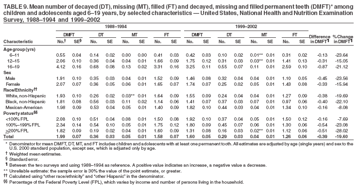 The mean DMFT among children and adolescents aged 6--19 years was 1.6 (Table 9). The mean DMFS was 2.7 (Table 10). Children and adolescents from families with incomes >200% of the FPL had a lower mean DMFS (2.1), compared with families with lower income (3.2 and 3.3). Overall, DMFS was lower in 1999--2002 than in 1988--1994, with an absolute reduction of 0.57 surfaces. Absolute reductions were larger among adolescents aged 16--19 years (1.24 surfaces) and among children and adolescents from families with incomes >200% of the FPL and non-Hispanic black children and adolescents (0.80 and 0.78, respectively) (Table 10, Figure 7).