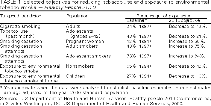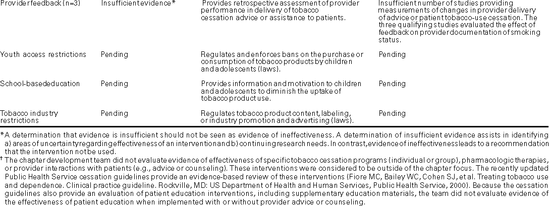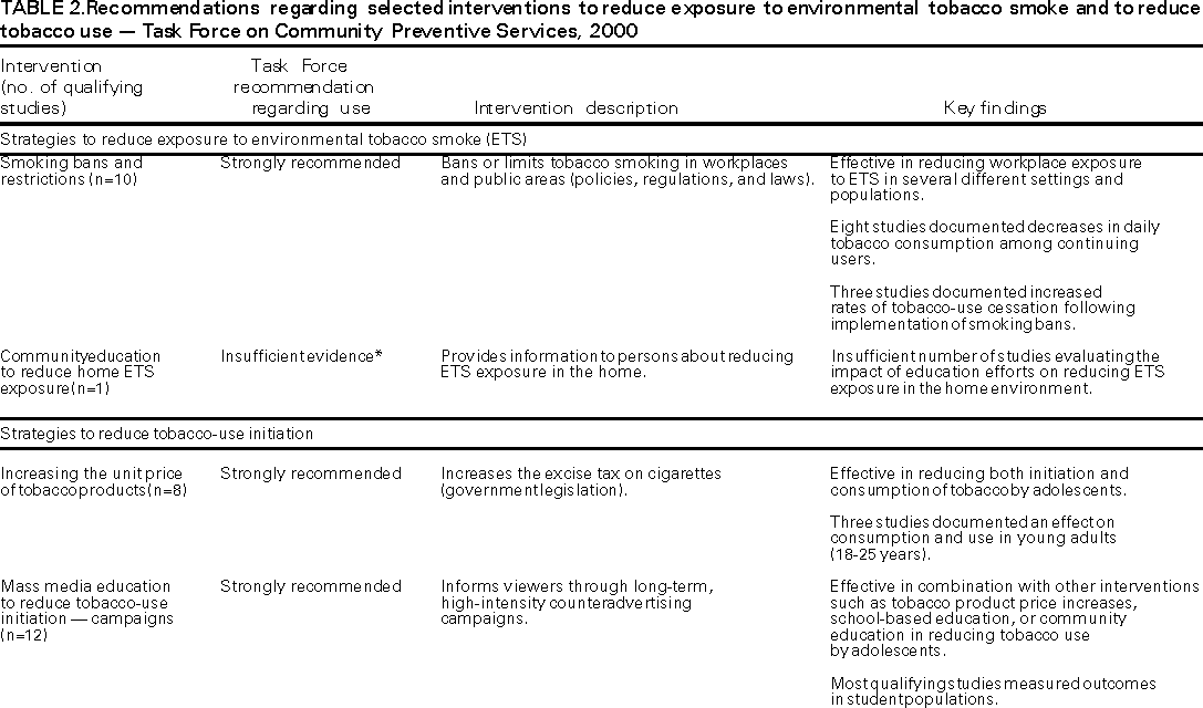 George J. Isham, M.D. Patricia A. Buffler, Ph.D., M.P.H. Mary Jane England, M.D. David W. Fleming, M.D.* Mindy Thompson Fullilove, M.D. Fernando A. Guerra, M.D., M.P.H. Alan R. Hinman, M.D., M.P.H. Garland H. Land, M.P.H. Charles S. Mahan, M.D. Patricia Dolan Mullen, Dr.P.H. Susan C. Scrimshaw, Ph.D. Robert S. Thompson, M.D. * As of June 2000, Dr. Fleming is with CDC in Atlanta, Georgia, and no longer serves on the Task Force. The following CDC staff members prepared this report: David P. Hopkins, M.D., M.P.H. Division of Prevention Research and Analytic Methods Epidemiology Program Office Corinne G. Husten, M.D., M.P.H. Office on Smoking and Health National Center for Chronic Disease Prevention and Health Promotion in collaboration with Jonathan E. Fielding, M.D., M.P.H., M.B.A. SummaryReducing tobacco-related morbidity and death is an ongoing challenge for health-care providers, health-care systems, and public health programs. Interventions are available that a) reduce exposure to environmental tobacco smoke, b) reduce tobacco-use initiation,* and c) increase tobacco-use cessation.**The Task Force on Community Preventive Services has conducted systematic reviews on 14 selected interventions, which are appropriate for communities and health-care systems, and has made recommendations regarding use of these interventions. This report summarizes the recommendations, identifies sources that offer full reviews of the interventions and details about applying the interventions locally, and provides an update of the Task Force's work. BACKGROUNDIn the United States, tobacco use is the leading cause of preventable death (1--3), and exposure to environmental tobacco smoke (ETS) is a preventable cause of significant morbidity and death among nonsmokers (4--6). Reducing tobacco use and reducing exposure to environmental tobacco smoke are essential community and public health objectives (7). As part of the Healthy People 2010 initiative (7), goals have been developed to reduce tobacco-related morbidity and death by reducing exposure to ETS, decreasing tobacco-use initiation, and increasing tobacco-use cessation (Table 1). By implementing interventions shown to be effective, policy makers and health-care and public health providers can help their communities achieve these goals while using community resources efficiently. This report and other related publications provide guidance from the Task Force on Community Preventive Services to personnel in state and local health departments, managed care organizations, purchasers of health care, persons responsible for funding public health programs, and others who have interest in or responsibility for decreasing tobacco use and reducing exposure to environmental tobacco smoke in all segments of the population. INTRODUCTIONThe independent, nonfederal Task Force on Community Preventive Services (the Task Force) is developing the Guide to Community Preventive Services (the Community Guide) with the support of the U.S. Department of Health and Human Services and in collaboration with public and private partners. CDC and other federal agencies provide staff support to the Task Force for development of the Community Guide. However, the recommendations presented in this report were developed by the Task Force and are not necessarily the recommendations of CDC or the U.S. Department of Health and Human Services. This MMWR report is the second to be completed for the Community Guide, a resource that will include multiple chapters, each focusing on a preventive health topic. The first chapter was on vaccine-preventable diseases (8--11), and the information in this report will be part of a second chapter, on tobacco use. This report provides an overview of the process used by the Task Force to select and review evidence; it summarizes the Task Force's recommendations on community interventions to reduce exposure to ETS and tobacco use. A full presentation of the recommendations, supporting evidence, and remaining research questions will be published in the American Journal of Preventive Medicine in 2001. For more information about this report, please call the Office on Smoking and Health (OSH) press line at 770-488-5493. Copies of this report may be obtained through OSH's Web site at <http://www.cdc.gov/tobacco> or by calling 770-488-5705 (press 3 to talk to an information specialist). METHODSMethods used to conduct systematic reviews and link evidence to recommendations have been described elsewhere (12). In brief, for each Community Guide chapter, multidisciplinary chapter development teams conduct reviews by