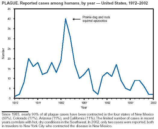 Enscore RE, Biggerstaff BJ, Brown TL, et al. Modeling relationships between climate and the frequency of human plague cases in the southwestern United States, 1960--1997. Am J Trop Med Hyg 2002;66:186--96.