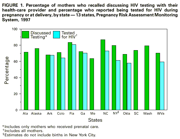 Persons using assistive technology might not be able to fully access information in this file. For assistance, please send e-mail to: mmwrq@cdc.gov. Type 508 Accommodation and the title of the report in the subject line of e-mail. Prenatal Discussion of HIV Testing and Maternal HIV Testing -- 14 States, 1996-1997In July 1995, the Public Health Service recommended that health-care providers counsel all pregnant women about human immunodeficiency virus (HIV) prevention and encourage testing for HIV infection (1) and, if indicated, initiate zidovudine therapy (2). To evaluate compliance with these recommendations, CDC analyzed population-based data on HIV counseling and testing during 1996-1997 from 14 states participating in the Pregnancy Risk Assessment Monitoring System (PRAMS). This report presents an analysis of survey data collected from 1996 through 1997; results indicate that HIV counseling and testing of pregnant women were common but varied by state, type of prenatal health-care provider, Medicaid status, and maternal demographic characteristics. PRAMS is an ongoing, state-based surveillance system that collects information about maternal behaviors, attitudes, and experiences. Each month, PRAMS surveys a random sample of mothers who have given birth to live infants during the previous 2-6 months using stratified, systematic sampling of resident birth certificates. A questionnaire is mailed to each mother, and a follow-up questionnaire is mailed to nonrespondents. Nonrespondents then are contacted by telephone. Statistical weights are applied to account for sampling probability, nonresponse, and sampling frame coverage in each state. The annual state-specific response rate to the entire questionnaire for 11 states in 1996 and 13 states in 1997 was approximately 70% (range: 69.4%-80.0%). Details of the survey design, questionnaire, and other operational aspects of the survey have been published (3). Beginning in 1996, mothers who received prenatal care were asked whether a doctor, nurse, or other health-care provider counseled them about testing for HIV. Mothers in eight states, regardless of whether they received prenatal care, were asked if they had been tested for HIV infection during pregnancy or at delivery. Mothers who received any prenatal care and responded to the provider test discussion question were included in the analysis (n=17,354 [97.4%] in 1996; n=19,693 [98.1%] in 1997). To analyze maternal HIV testing, data were included on all mothers who responded to the HIV testing question regardless of having received prenatal care (n=8420 [89.8%] in 1996; n=11,152 [91.0%] in 1997). To account for the complex survey design, SUDAAN was used to calculate point estimates, risk ratios, and 95% confidence intervals (CIs) surrounding the risk ratios. State-specific risk ratios were considered significant if the 95% CI did not include 1. State-specific risk ratios are not presented for sparse data (response categories with less than 20 women). During 1997, the state-specific proportion of mothers who recalled discussing HIV testing with their prenatal health-care provider ranged from 63.4% (Maine) to 86.7% (North Carolina), and the proportion of mothers who recalled being tested ranged from 58.0% (Oklahoma) to 80.7% (Florida) (Figure 1). Among 10 states with data from 1996 to 1997, increases in testing discussions occurred in New York (22.8%), Oklahoma (17.8%), and West Virginia (15.3%). Seven states demonstrated no increases (range: -2 to 0.9%) in prenatal testing discussions. The largest increase in reporting of maternal testing from 1996 to 1997 occurred in New York (18.1%). Smaller increases occurred in West Virginia (15.2%), Florida (14.3%), Oklahoma (11.5%), and Georgia (6.5%). During 1997 in all states, black mothers were significantly more likely than white mothers to report that their provider discussed testing (risk ratio [RR]=1.05-1.29). Hispanic mothers were not significantly more likely to report having had a testing discussion in most states. In seven states, mothers with less than a high school education were significantly more likely (RR=0.96-1.22) to recall a discussion about testing. Similarly, in 11 states, mothers aged less than 25 years were significantly more likely to recall a discussion about testing (RR=1.04-1.25). Public health-care providers were more likely than private providers to discuss testing (RR=0.96-1.29) in 10 states. In 11 states, mothers who received Medicaid benefits during pregnancy were significantly more likely to report discussions with a health-care provider (RR=0.99-1.32). In most states, black race, type of prenatal health-care provider, education level, age, and receipt of Medicaid benefits were associated significantly with maternal HIV testing. However, associations between maternal characteristics and testing discussions were stronger than associations between maternal characteristics and actual testing. Reported by: Pregnancy Risk Assessment Monitoring System Working Group, Div of Reproductive Health, National Center for Chronic Disease Prevention and Health Promotion; Div of HIV/AIDS-Surveillance and Epidemiology, National Center for HIV, STD, and TB Prevention, CDC. Editorial Note:Editorial Note: This report documents a substantial level of counseling about HIV testing and receipt of testing for women who have given birth since publication of the 1995 guidelines. In 1997, greater than 70% of women in nine states recalled discussing HIV testing with their health-care provider during prenatal care, and at least 50% of women in all states reported being tested for HIV during pregnancy or at delivery. Data from PRAMS suggest that physician practices regarding prenatal HIV testing discussions and prenatal maternal HIV testing may be influenced by state-specific variations in HIV seroprevalence rates among childbearing women and physician perceptions of maternal HIV risk factors. Health-care providers serving women in states with high H