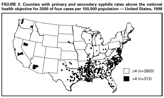 Persons using assistive technology might not be able to fully access information in this file. For assistance, please send e-mail to: mmwrq@cdc.gov. Type 508 Accommodation and the title of the report in the subject line of e-mail. Primary and Secondary Syphilis -- United States, 1998Rates of primary and secondary (P&S) syphilis have been declining in the United States since the last national epidemic in 1990 (Figure 1) (1). Syphilis causes substantial morbidity and mortality in the form of cardiac and neurologic disease, stillbirth and developmental disability from congenital syphilis, and by facilitating transmission of human immunodeficiency virus (2,3). Syphilis is both preventable and curable and has been successfully controlled in most developed countries (4). In the United States, declines in P&S syphilis have been followed by epidemics occurring approximately every 7-10 years. During 1960-1990, these cyclical epidemics resulted in progressively higher peaks in morbidity (5). To evaluate the epidemiology of syphilis in the United States, CDC analyzed notifiable disease surveillance data for 1998. This report summarizes the results of that analysis, which indicate that in 1998 P&S syphilis declined to the lowest rates ever reported in the United States and that syphilis transmission increasingly is concentrated in fewer geographic areas. Summary data for syphilis cases reported to state health departments and the District of Columbia for 1998 were sent quarterly and annually to CDC. These data included the total number of syphilis cases by county of residence, sex, stage of disease, racial/ethnic group, and 5-year age group. Data on reported cases of P&S syphilis were analyzed for this report because these cases best represent incidence (i.e., newly acquired infections within the evaluated time). P&S syphilis rates were calculated per 100,000 persons using population denominators from the Bureau of the Census (5). In 1998, 6993 cases of P&S syphilis were reported in the United States (rate: 2.6 cases per 100,000 population), representing a 19% decrease in cases reported in 1997 (rate: 3.2) and an 86% decrease from the 50,578 cases reported in 1990 (rate: 20.3), the peak of the most recent U.S. epidemic (5) (Figure 1). In 1998, the rate of P&S syphilis was higher in the South (5.1) than in the Midwest (1.9), West (1.0), and Northeast (0.8); the rate of decline from 1997 to 1998 was greater in the Northeast (27%) than in the South (22%), Midwest (3%), and West (0%).* The rate of P&S syphilis was higher in blacks (17.1) than in American Indians/Alaska Natives (2.8), Hispanics (1.5), non-Hispanic whites (0.5), and Asians/Pacific Islanders (0.4). In 1998, the rate ratio of P&S syphilis in non-Hispanic blacks compared with non-Hispanic whites was 34:1, which is substantially lower than 44:1 in 1997 and 53:1 in 1990. Rates for P&S syphilis were 30% higher in men than in women in 1998. The incidence of P&S syphilis was highest among women aged 20-24 years and among men aged 30-39 years. During 1997-1998, the number of P&S syphilis cases declined or remained the same in 35 states and the District of Columbia (Table 1). The number of cases increased in 15 states; seven of these states are in the West. Although the absolute number of cases in the West was low, increases in Arizona and Washington were notable. Three other states reported substantial increases from 1997 to 1998: Louisiana, Indiana, and Michigan. Forty states had rates of P&S syphilis below 4.0, the target rate of the national health objectives for 2000 (objective 19.3) (5). Fourteen states reported five or fewer cases of syphilis. In 1998, 28 (0.9%) of 3115 counties accounted for 50% of P&S syphilis cases (Table 2), a 10% decrease from 31 counties in 1997. The South was disproportionately represented in the counties with the highest number of cases (19 of 28 counties). Counties/cities with the highest number of cases were Baltimore, Maryland; Cook County, Illinois (Chicago); Shelby County, Tennessee (Memphis); and Davidson County, Tennessee (Nashville). In 1998, 10 of the 28 counties had an increase in cases of P&S syphilis. Counties with the greatest percentage increase in cases were MarionCounty, Indiana (Indianapolis), Mecklenberg County, North Carolina (Charlotte), Maricopa County, Arizona (Phoenix), and Wayne County, Michigan (Detroit). In 1998, 2803 (90%) counties had rates of P&S syphilis equal to or below the 2000 national objective (Figure 2). In 1998, the number of counties reporting no cases of P&S syphilis increased to 2430 (78%) from 2324 (75%) in 1997. Reported by: State and local health depts. Epidemiology and Surveillance Br, Statistics and Data Management Br, Div of Sexually Transmitted Diseases Prevention, National Center for HIV, STD, and TB Prevention, CDC. Editorial Note:The number and rate of P&S syphilis cases reported in 1998 in the United States are record lows. Syphilis is progressively concentrated geographically; in 1998, 50% of P&S syphilis cases occurred in fewer counties than in 1997, and the number of cases in most of those counties declined in 1998. In 1998, approximately 80% of U.S. counties reported no infectious syphilis. Despite progress in syphilis control nationally, increases have occurred in several states and local areas. Focal outbreaks have occurred in both Marion County, Indiana (Indianapolis) (associated with exchanging sex for drugs or money), and King County, Washington (Seattle) (associated with increases in cases among men who have sex with men) (6,7). The variation in demographics over time and between regions highlights the importance of analyzing demographic and behavioral information and developing targeted interventions. Despite considerable declines in syphilis rates, continued attention must focus on educating and screening persons in settings associated with high-risk behaviors, maintaining high quality surveillance systems, and recognizing changing demographics. The find