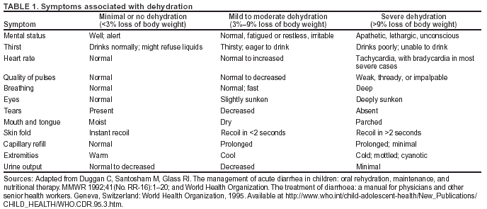 Management of Acute Gastroenteritis Among Children External: Richard Cash, M.D., Harvard School of Public Health, Boston, Massachusetts; Olivier Fontaine, M.D., World Health Organization, Geneva, Switzerland; William B. Greenough, III, M.D., Johns Hopkins University, Baltimore, Maryland; Ronald E. Kleinman, M.D., Harvard Medical School, Boston, Massachusetts; Myron (Mike) Levine, M.D., University of Maryland, Baltimore, Maryland; David R. Nalin, M.D., West Chester, Pennsylvania; Margaret B. Rennels, M.D., Center for Vaccine Development, Baltimore, Maryland; Mathuram Santosham, M.D, Johns Hopkins Bloomberg School of Public Health, Baltimore, Maryland; and John Snyder, M.D., University of California Medical Center, San Francisco, California. CDC: James M. Hughes, M.D., and Steve Ostroff, M.D., Office of the Director, National Center for Infectious Diseases (NCID); Caryn Bern, M.D., Division of Parasitic Diseases, NCID; Eric Mintz, M.D., Division of Bacterial and Mycotic Diseases, NCID; Larry Pickering, M.D., Office of the Director, National Immunization Program; and Larry Anderson, M.D., James LeDuc, Ph.D., and Umesh Parashar, M.B.B.S., Division of Viral and Rickettsial Diseases, NCID. Table 1 ![]() Return to top. Box 1 ![]() Return to top. Table 2 ![]() Return to top. Box 2 ![]() Return to top. Table 3 ![]() Return to top. Figure ![]() Return to top.
