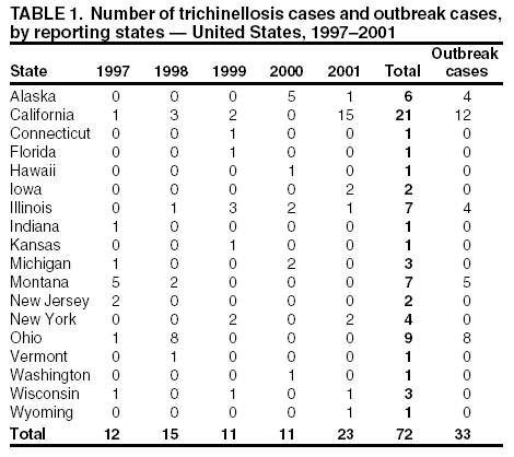 Persons using assistive technology might not be able to fully access information in this file. For assistance, please send e-mail to: mmwrq@cdc.gov. Type 508 Accommodation and the title of the report in the subject line of e-mail. Trichinellosis Surveillance --- United States, 1997--2001Sharon L. Roy, M.D. AbstractProblem/Condition: Trichinellosis is a parasitic disease caused by tissue-dwelling roundworms of the species Trichinella spiralis. The organism is acquired by eating Trichinella-infected meat products. The disease has variable clinical manifestations, ranging from asymptomatic to fatal. In the United States, trichinellosis has caused hundreds of preventable cases of illness and occasional deaths. The national trichinellosis surveillance system has documented a steady decline in the reported incidence of this disease, as well as a change in its epidemiology. Reporting Period Covered: This report summarizes surveillance data for trichinellosis in the United States for 1997--2001. Description of System: Trichinellosis became a nationally reportable disease in 1966, but statistics have been kept on the disease since 1947. The national trichinellosis surveillance system is a passive system that relies on existing resources at the local, state, and federal levels. Cases are diagnosed based on clinical history with laboratory confirmation. Cases are reported weekly to CDC through the National Electronic Telecommunications System for Surveillance (NETSS). Detailed data regarding signs and symptoms, diagnostic tests, and food consumption are gathered by using a supplementary standardized surveillance form and are reported to CDC by fax or mail. This information is compared with NETSS data several times a year by CDC staff. Discrepancies are reviewed with the state health departments. The purpose of the surveillance system is to determine the incidence of trichinellosis, to maintain awareness of the disease, to monitor epidemiologic changes, to identify outbreaks, to guide prevention efforts, and to measure the effectiveness of those efforts. Results: Although trichinellosis was associated historically with eating Trichinella-infected pork from domesticated sources, wild game meat was the most common source of infection during 1997--2001. During this 5-year period, 72 cases were reported to CDC. Of these, 31 (43%) cases were associated with eating wild game: 29 with bear meat, one with cougar meat, and one with wild boar meat. In comparison, only 12 (17%) cases were associated with eating commercial pork products, including four cases traced to a foreign source. Nine (13%) cases were associated with eating noncommercial pork from home-raised or direct-from-farm swine where U.S. commercial pork production industry standards and regulations do not apply. Interpretations: The majority of the decline in reported trichinellosis cases is a result of improved observance of standards and regulations in the U.S. commercial pork industry, which has altered animal husbandry practices resulting in reduced Trichinella prevalence among swine. Public Health Actions: Because of the change in epidemiology of trichinellosis and the continued occurrence of cases among consumers of wild game meat and noncommercial pork, more targeted public education is needed to further reduce the incidence of this disease. IntroductionTrichinellosis is a parasitic disease caused by a roundworm of the Trichinella genus that infects carnivorous and omnivorous animals, including domestic swine and wild game (e.g., bears, cougars, and wild boars) (1). Humans become infected when they eat meat cooked inadequately from these animals containing larval cysts of Trichinella spp. Trichinellosis has a broad clinical presentation, ranging from asymptomatic to fatal. Initial symptoms of abdominal pain, vomiting, diarrhea, constipation, and low-grade fever might occur within 1 week of ingestion of infected meat, as the larvae invade the bowel wall. These symptoms might be followed in approximately 1--8 weeks by facial edema, peripheral edema, headaches, intermittent fever, conjunctivitis, rashes, pruritus, cough, myalgia, and eosinophilia, as the larvae migrate through the tissues and encyst in the muscles (2,3). Fatal cases might result from neurologic and myocardial complications (3). In the United States, the national trichinellosis surveillance system has documented a steady decline in the reported incidence of this disease. During 1947--1951, a median of 393 cases (range: 327--487) was reported annually, including 57 trichinellosis-related deaths (4). During 1997--2001, the incidence decreased to a median of 12 cases annually (range: 11--23) and no reported deaths. No apparent change in the trichinellosis surveillance system can account for this decline. However, because the surveillance system is not designed to detect asymptomatic cases, the number of reported cases probably represents only a portion of the total number of infections. Historically, pork products were the most commonly identified source of Trichinella infection in the United States. However, the number of annual reported cases attributed to pork has declined for many years, largely because of changes implemented by the U.S. pork industry that have resulted in reduced prevalence of Trichinella among domestic swine. This report presents data for 1997--2001 on trichinellosis and describes the changing epidemiology of this disease. MethodsState health departments report new cases of trichinellosis by week to CDC through the National Electronic Telecommunications System for Surveillance (NETSS) and through trichinellosis surveillance case report forms (CDC 54.7 Rev. 02-90) containing additional epidemiologic information. Additional cases might be identified through laboratory testing for Trichinella performed at CDC or through investigations conducted by CDC. NETSS data are reviewed several times a year and matched to case report forms or laboratory reports. A confirm