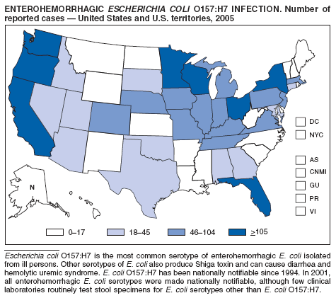 Data in the Summary were derived primarily from reports transmitted to CDC from health departments in the 50 states, five territories, New York City, and the District of Columbia. Data were reported for MMWR weeks 1--52, which correspond to the period for the week ending January 8, 2005, through the week ending December 31, 2005. More information regarding infectious notifiable diseases, including case definitions, is available at http://www.cdc.gov/epo/dphsi/phs.htm. Policies for reporting notifiable disease cases can vary by disease or reporting jurisdiction. The case-status categories used to determine which cases reported to NNDSS are published, by disease or condition, and are listed in the print criteria column of the 2006 NNDSS event code list (available at http://www.cdc.gov/epo/dphsi/phs/files/NNDSSeventcodelistJanuary2006.pdf).