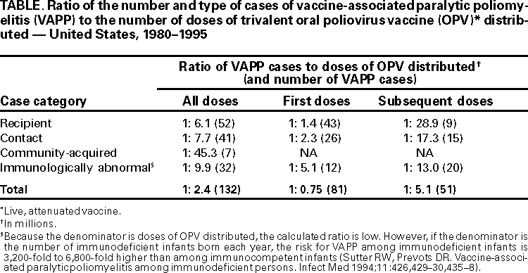 45. Sutter RW, Prevots DR. Vaccine-associated paralytic poliomyelitis among immunodeficient persons. Infect Med 1994;11:426, 429--30, 435--8.