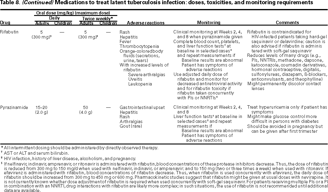 Clinical and Laboratory MonitoringOnce patients have been identified and then tested for LTBI, they should receive an initial clinical evaluation. They should also receive follow-up evaluations at least monthly (if receiving isoniazid alone or rifampin alone) and at 2, 4, and 8 wk (if receiving rifampin and pyrazinamide). This evaluation should include questioning about side effects and a brief physical assessment checking for signs of hepatitis. Patients should be educated about the side effects associated with treatment of LTBI and advised to stop treatment and promptly seek medical evaluation when they occur. Baseline laboratory testing is not routinely indicated for all patients at the start of treatment for LTBI (see Table 8). Patients whose initial evaluation suggests a liver disorder should have baseline hepatic measurements of serum aspartate aminotransferase (serum glutamic oxaloacetic transaminase) (AST [SGOT]) or alanine aminotransferase (serum glutamic pyruvic transaminase) (ALT [SGPT]) and bilirubin. Baseline testing is also indicated for patients with HIV infection, pregnant women, and women in the im mediate postpartum period (i.e., within 3 mo of delivery), persons with a history of chronic liver disease (e.g., hepatitis B or C, alcoholic hepatitis, or cirrhosis), persons who use alcohol regularly, and persons at risk for chronic liver disease. Baseline testing is not routinely indicated in older persons. However, such testing may be considered on an individual basis, particularly for patients who are taking other medications for chronic medical conditions. Active hepatitis and end-stage liver disease are relative contraindications to the use of isoniazid or pyrazinamide for treatment of LTBI. Routine laboratory monitoring during treatment of LTBI is indicated for persons whose baseline liver function tests are abnormal and other persons at risk for hepatic disease. Laboratory testing may also be indicated for the evaluation of possible adverse effects that occur during the course of treatment (e.g., liver function studies for patients with symptoms compatible with hepatotoxicity or a uric acid measurement to evaluate complaints of joint pain). Some experts recommend that isoniazid should be withheld if transaminase levels exceed three times the upper limit of normal if associated with symptoms and five times the upper limit of normal if the patient is asymptomatic. INTRODUCTIONHistory of Treatment of Latent Tuberculosis Infection and Relevance to Tuberculosis ControlFor more than three decades, treatment of persons with latent Mycobacterium tuberculosis infection (LTBI) to prevent the development of active disease has been an essential component of tuberculosis (TB) control in the United States (4). In the United States and other countries with a low incidence of TB, most new, active cases have occurred among persons who were once infected, contained this infection, and then later developed active TB (5). The identification and treatment of infected persons at highest risk for developing disease benefit both infected persons and susceptible persons in their communities. Until recently, isoniazid was the only drug proven effective and thus recommended for treatment of LTBI. Shortly after isoniazid was found to be effective for the treatment of TB, clinical trials were begun to assess the ability of the drug to prevent progression of primary disease in children. When it was found that this intervention was highly effective, larger trials were begun to evaluate the drug for treatment of infected contacts of TB patients and of other persons at high risk (e.g., those with radiographic evidence of prior, untreated TB) (6). In 1965, isoniazid treatment of LTBI was first recommended for general use by the American Thoracic Society (ATS) (7). This initial statement recommended isoniazid for persons with evidence of previously untreated TB and persons with recent tuberculin skin test conversions, including all children younger than 3 yr of age with a positive tuberculin skin test. In 1967, ATS and PHS broadened the recommendations to include all persons who had had a purified protein derivative (PPD) tuberculin skin-test reaction of >10 mm. The recommendations stated that chemoprophylaxis is mandatory for a) persons with inactive cases of TB who were not previously treated and their contacts, b) persons with tuberculin skin test conversions, c) persons with specified medical conditions, and d) all persons younger than 20 yr of age who had had positive tuberculin skin tests (8). With widespread use of such an inexpensive drug that had "virtually no side effects," it was believed that "chemoprophylaxis [could] reduce future morbidity from TB in high risk groups by some 50 to 75 percent" (8). However, despite this belief, the goal of reducing TB morbidity by such a substantial percentage through the administration of isoniazid was never reached. In 1970, among several thousand persons who began isoniazid treatment as a result of an outbreak of TB on Capitol Hill in the District of Columbia, 19 persons developed clinical signs of liver disease and two persons died of hepatic failure attributed to isoniazid (9). The recognition that isoniazid was associated with potentially fatal hepatitis led to the development of guidelines regarding pretreatment screening and monitoring to minimize the risk for severe complications (10). In 1974, following a study to quantify the risk for isoniazid-related hepatitis (11), guidelines for treatment of LTBI were updated. The revised guidelines excluded low-risk persons aged older than 35 yr of age as candidates for treatment (12). Subsequent controversy over the appropriate age cut-off for these low-risk, tuberculin-positive persons ensued, with one group concluding that the risks of treatment of LTBI outweighed the benefits for young adults (13). This controversy and resulting confusion led to a decrease in the use of isoniazid for treating persons wi
