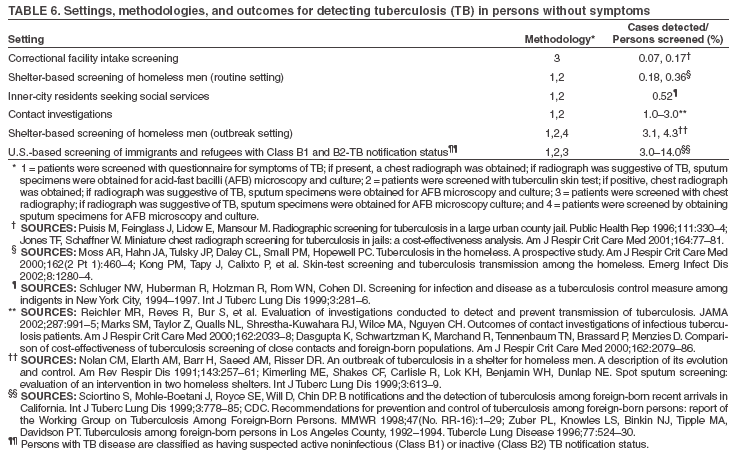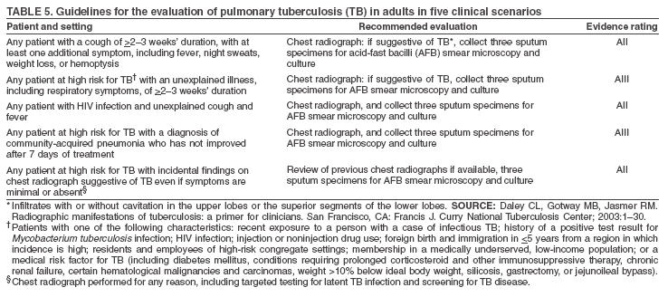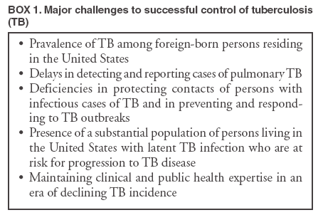 of America (ISDA), and CDC Chair: Charles M. Nolan, MD, Seattle-King County Department of Public Health, Seattle, Washington (American Thoracic Society). Co-chairs: Henry M. Blumberg, MD, Emory University School of Medicine, Atlanta, Georgia (Infectious Diseases Society of America), Zachary Taylor, MD, National Center for HIV, STD, and TB Prevention, CDC, Atlanta, Georgia. Members: John Bernardo, MD, Boston University School of Medicine, Boston, Massachusetts; Patrick J. Brennan, MD, University of Pennsylvania School of Medicine, Philadelphia, Pennsylvania; Nancy E. Dunlap, MD, PhD, University of Alabama at Birmingham, Birmingham, Alabama; Charles L. Daley, MD, National Jewish Medical and Research Center, Denver, Colorado; Wafaa M. El-Sadr, MD, Harlem Hospital and Columbia University, New York City, New York; Sue Etkind, MS, Massachusetts Department of Public Health, Jamaica Plain, Massachusetts; Mark FitzGerald, MD, University of British Columbia, Vancouver, British Columbia, Canada; James B. McAuley, MD, Rush Medical College, Chicago, Illinois; Marisa Moore, MD, Centers for Disease Control and Prevention, Atlanta, Georgia; Noreen L. Qualls, DrPH, Centers for Disease Control and Prevention, Atlanta, Georgia; Randall R. Reves, MD, Denver Public Health, Denver, Colorado; Sarah E. Royce, MD, California Department of Health Services, Berkeley, California; Max Salfinger, MD, Wadsworth Center, New York State Department of Health, Albany, New York; Jeffrey R. Starke, MD, Texas Children's Hospital and Baylor College of Medicine, Houston, Texas; Wanda Walton, PhD, Centers for Disease Control and Prevention, Atlanta, Georgia; Stephen E. Weis, DO, University of North Texas Health Science Center at Fort Worth, Fort Worth, Texas; and Jan Young, MS, California Department of Health Services, Berkeley, California. Table 1 ![]() Return to top. Figure 1 ![]() Return to top. Box 1 ![]() Return to top. Table 2 ![]() Return to top. Figure 2 ![]() Return to top. Box 2 ![]() Return to top. Table 3 ![]() Return to top. Figure 3 ![]() Return to top. Box 3 ![]() Return to top. Table 4 ![]() Return to top. Figure 4 ![]() Return to top. Box 4 ![]() Return to top. Table 5 ![]() Return to top. Box 5 ![]() Return to top. Table 6 ![]() Return to top. Box 6 ![]() Return to top. Table 7 ![]() Return to top. Box 7 ![]() Return to top. Table 8 ![]() Return to top.