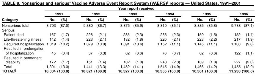 Overall, 14.2% of all reports received in VAERS during 1991--2001 described serious adverse events (10) (Table 9). During 1991--2001, reports of deaths ranged from 1.4%--2.3%, and reports of life-threatening illness ranged from 1.4%--2.8% of all adverse event reports. During the previous 3 years when distribution of vaccines reached the highest level, the annual percentage of reports of death was stable, approximately 1.5% of all adverse event reports. The reports of life-threatening illness were also stable throughout the years except for a peak of 2.8% in 1999, which reflected RRV-TV and intussusception incident that occurred in that year.