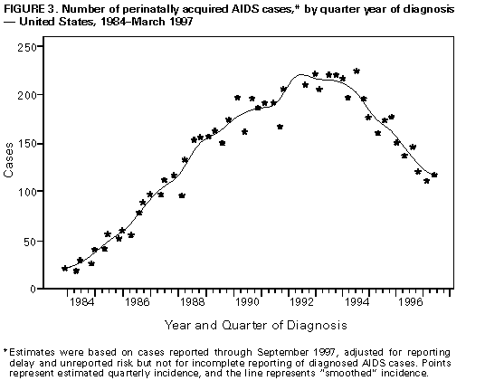 Persons using assistive technology might not be able to fully access information in this file. For assistance, please send e-mail to: mmwrq@cdc.gov. Type 508 Accommodation and the title of the report in the subject line of e-mail. Update: Perinatally Acquired HIV/AIDS -- United States, 1997Perinatal transmission of human immunodeficiency virus (HIV) accounts for virtually all new HIV infections in children (1). Through 1993, an estimated 15,000 HIV-infected children were born to HIV-positive women in the United States (2). In 1994, clinical trials demonstrated a two-thirds reduction in the risk for perinatal transmission associated with treatment of HIV-infected pregnant women and their infants with zidovudine (ZDV) therapy (3). The Public Health Service (PHS) issued guidelines for the use of ZDV to reduce perinatal transmission in August 1994 and for universal HIV counseling and voluntary testing of pregnant women in July 1995 (3,4). This report describes increases in HIV testing and use of ZDV treatment among HIV-infected mothers and a continued substantial decline in the incidence of acquired immunodeficiency syndrome (AIDS) during 1992-1996 among children who were infected through perinatal HIV transmission (5). * For states that conduct HIV surveillance, characteristics were examined for children born to HIV-infected mothers (i.e., perinatally exposed) during 1993-1996. Children were classified into one of four categories: those with AIDS, those with HIV infection but without AIDS, those who were uninfected, and those of indeterminate infection status. Timely ascertainment of HIV infection status of children born in 1995 for HIV reporting states versus AIDS-only reporting states was assessed in comparison to estimates of the number of births to HIV-infected women from the National HIV Serosurvey of Childbearing Women (SCBW) (2). Trends in perinatally acquired AIDS incidence were analyzed by quarter year of diagnosis from January 1984 through March 1997 and were adjusted for reporting delays with reclassification of cases initially reported with no identified risk (1). Evaluation of efforts to reduce perinatal transmission following issuance of the PHS guidelines was restricted to analysis of the estimated incidence of perinatally acquired AIDS among infants (aged less than 1 year) by year of birth. To control for changing birth rates, rates of perinatally acquired AIDS for infants per 100,000 births were calculated by using natality data from CDC's National Center for Health Statistics for births from 1992 through June 1995 (the latest birth cohort for which estimates are reliable). Perinatal HIV Surveillance A total of 29 states conducted surveillance for HIV infection among children. These states reported 28% of the cumulative perinatally acquired AIDS cases through September 1997. In these states, perinatally exposed children are monitored to determine their HIV-infection and AIDS status, dates of maternal HIV tests, receipt of prenatal care, and maternal and neonatal use of ZDV and other antiretrovirals during pregnancy. Of children born to HIV-infected mothers from 1993 through 1996, these states reported 4325 children who had perinatally acquired AIDS (344) or HIV infection but without AIDS (487) or who were uninfected or indeterminate (3494). Since the PHS guidelines were issued in August 1994, 2027 (87%) HIV-infected mothers of children reported in these states had HIV infection diagnosed before or at the child's birth and 179 (8%) after the child's birth; the timing of HIV infection diagnosis was unknown for 121 (5%) (Figure_1). For children born from 1994 through 1996, the proportion of HIV-infected mothers who were prescribed prenatal ZDV increased from 24% to 64% (Figure_2). Compared with the expected number of children born to HIV-infected women estimated from the SCBW, as of September 1997, states with HIV surveillance ** identified a median of 64% of children born in 1995 compared with a median of 3% in states with AIDS reporting only. Characteristics of Perinatally Acquired AIDS Cases As of September 30, 1997, perinatal transmission of HIV accounted for 7310 (1%) of the 626,334 total AIDS cases in adults and children reported to CDC by state and territorial health departments. Perinatally acquired cases have been reported from 48 states, the District of Columbia, Puerto Rico, and the Virgin Islands. Five states and/or territories accounted for 64% of all perinatally acquired AIDS cases: New York (27%); Florida (17%), New Jersey (9%), California (6%), and Puerto Rico (5%). The Northeast (44%) and the South (36%) accounted for most (80%) such cases; 85% of cases were diagnosed in metropolitan areas with a population of greater than 500,000 persons and 9% in metropolitan areas with populations of 50,000-500,000 persons. Of the 7310 children with perinatally acquired AIDS, 4461 (61%) were non-Hispanic black, 1723 (24%) were Hispanic, 1057 (14%) were non-Hispanic white, and 54 (less than 1%) were either Asian/Pacific Islander or American Indian/Alaskan Native; 15 were of unknown race/ethnicity. The median age at diagnosis was 17 months, with 40% of cases diagnosed in children aged less than 1 year; 47%, in children aged 1-5 years; and 13%, in children aged greater than or equal to 6 years. Trends in Perinatally Acquired AIDS From 1984 through 1992, the estimated number of children with perinatally acquired AIDS diagnosed each year increased, then declined 43% during 1992-1996 (Figure_3). From 1992 to 1996, declines were similar by race/ethnicity, regions of the United States, and in urban and rural areas (Table_1). Declines were largest among children for whom AIDS was diagnosed at younger ages (less than 5 years). When the analysis was restricted to children diagnosed with perinatally acquired AIDS at age less than 1 year, for birth years 1992 through 1995, the estimated numbers of cases diagnosed in infants was highest among 1991-1992 birth cohorts, then declined 42% fr