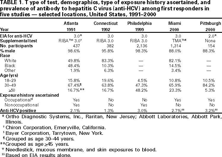 Persons using assistive technology might not be able to fully access information in this file. For assistance, please send e-mail to: mmwrq@cdc.gov. Type 508 Accommodation and the title of the report in the subject line of e-mail. Hepatitis C Virus Infection Among Firefighters, Emergency Medical Technicians, and Paramedics --- Selected Locations, United States, 1991--2000First responders (e.g., firefighters, emergency medical technicians [EMTs], and paramedics) are at risk for occupational exposure to bloodborne pathogens. Recently, CDC has received inquiries from state and local health departments and occupational health services about the prevalence of hepatitis C virus (HCV) infection among first responders and the need for routine HCV testing among these workers. This report summarizes the findings of five studies of HCV infection among first responders. Although some of these workers may need HCV testing under certain circumstances, this report indicates that first responders are not at greater risk than the general population for HCV infection; therefore, routine HCV testing is not warranted. First responders should continue to follow standard precautions to reduce workplace exposure to bloodborne pathogens. Philadelphia, PennsylvaniaDuring November--December 1999, Home Access Health Corporation (Hoffman Estates, Illinois)* offered specimen collection kits (Hepatitis C Check) to 4400 active and retired members of the Philadelphia firefighters union. Respondents telephoned a toll-free number to receive their test results and to answer questions anonymously about nonoccupational risk factors for HCV infection. According to Home Access®, serum was tested for antibody to HCV (anti-HCV) with an enzyme immunoassay (EIA 3.0; Ortho Diagnostic Systems, Inc., Raritan, New Jersey); repeatedly reactive samples were tested with a supplemental recombinant immunoblot assay (RIBA 3.0, Chiron Corporation, Emeryville, California). In February 2000, Home Access reported that of 2146 respondents, 97 (4.5%) screened positive for anti-HCV. The company indicated that this prevalence was 2.5 times higher than the national average of 1.8% (Home Access Health Corporation, personal communication, 2000). In June 2000, CDC re-analyzed serologic and questionnaire data and found that of 2136 participants, 64 (3.0%) tested anti-HCV--positive (Table 1). The highest prevalence (4.9%) was among men aged 40--49 years (Figure 1). Risk factors associated with HCV infection were a history of blood transfusion before 1992 (age-adjusted prevalence ratio [PR]=2.2; 95% confidence interval [CI]=1.2--4.0) and illicit drug use (age-adjusted PR=4.0; 95% CI=2.2--7.1). On the basis of CDC's analysis, the 4.5% prevalence previously reported by Home Access was obtained by classifying as positive samples that tested EIA repeatedly reactive but indeterminate by RIBA, and those that tested EIA repeatedly reactive or EIA initially reactive for which no further testing was done (Table 2). Atlanta, GeorgiaIn 1991, CDC conducted a voluntary, anonymous survey among metropolitan Atlanta uniformed fire department personnel to assess occupational and nonoccupational risk factors for hepatitis B virus (HBV) infection (1). In May 2000, stored serum samples were tested at CDC for anti-HCV using EIA 3.0; repeatedly reactive samples were tested by RIBA 3.0. Of the 437 firefighters tested, nine (2.1%) were anti-HCV--positive (Table 1); the highest prevalence (4.0%) was among men aged 35--39 years. HCV infection was not associated with duration of employment as a firefighter, occupational exposures to blood, history of blood transfusion, or illicit drug use; however, HCV infection was associated with a history of a sexually transmitted disease (PR=7.4; 95% CI=1.6--35.3). ConnecticutIn 1992, Connecticut Department of Public Health and Addiction Services collected serum samples and demographic data on a voluntary basis from first responders in various regions in Connecticut for a study on the immune response to hepatitis B vaccine (2). In June 2000, stored serum samples from the 1992 study were tested anonymously at CDC for anti-HCV by EIA 3.0 and RIBA 3.0. Among 382 volunteer and professional firefighters and EMTs for whom serum samples were available, five (1.3%) tested anti-HCV--positive (Table 1); prevalence was highest (2.6%) among men aged 40--49 years. Miami-Dade County, FloridaDuring March--April 2000, Hep-C ALERT, a patient advocacy organization, collaborating with University of Pittsburgh researchers, confidentially obtained serum samples and information on occupational risk factors from Miami-Dade County municipal fire department personnel. Serum samples were tested at a commercial laboratory for anti-HCV with EIA 3.0; repeatedly reactive samples were tested for HCV RNA by transcription mediated amplification (TMA) (Bayer Corporation, Tarrytown, New York). Of the 1314 participants, 35 (2.7%) were anti-HCV--positive on the basis of EIA testing alone, and 20 (1.5%) were confirmed positive for HCV RNA (Table 1). Prevalence of anti-HCV was highest (3.7%) among men aged >50 years. Increased risk for HCV infection was not associated with occupational exposures to blood, type of job (firefighter, EMT, or paramedic), or duration of employment as a first responder. Pittsburgh, PennsylvaniaDuring January--March 2000, University of Pittsburgh researchers collected serum samples and information on occupational exposures from paramedics working in Pittsburgh. Samples were tested for anti-HCV by EIA 2.0 (Abbott Laboratories, Abbott Park, Illinois) without supplemental or confirmatory testing. Five (3.2%) of 154 respondents tested anti-HCV--positive (Table 1); highest prevalence (5.2%) was among men aged 40--49 years. Anti-HCV positivity was not associated with occupational exposures to blood. Reported by: AJ Roome, PhD, HIV/AIDS Surveillance Program, JL Hadler, MD, State Epidemiologist, Connecticut Dept of Public Health. AL Thomas, B Migicovsky, MD, Hep