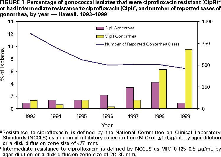 Persons using assistive technology might not be able to fully access information in this file. For assistance, please send e-mail to: mmwrq@cdc.gov. Type 508 Accommodation and the title of the report in the subject line of e-mail. Fluoroquinolone-Resistance in Neisseria gonorrhoeae, Hawaii, 1999, and Decreased Susceptibility to Azithromycin in N. gonorrhoeae, Missouri, 1999In 1999, 360,076 cases of gonorrhea were reported in the United States (1). Gonorrhea is a major cause of pelvic inflammatory disease, often leading to ectopic pregnancy and infertility, and it can facilitate human immunodeficiency virus (HIV) transmission (2). During the 1980s, resistance to penicillin and tetracycline among gonococcal isolates became widespread; as a result, CDC recommended that other antimicrobial agents be used to treat gonorrhea. This report summarizes investigations of an increase in fluoroquinolone-resistant Neisseria gonorrhoeae in Hawaii and of a cluster of N. gonorrhoeae infections with decreased susceptibility to azithromycin in Missouri. N. gonorrhoeae with fluoroquinolone-resistance, HawaiiThe susceptibility of N. gonorrhoeae to ciprofloxacin is used to assess susceptibility to all equivalent fluoroquinolone antimicrobials. The Hawaii Department of Health State Laboratory (HSL) routinely performs antimicrobial susceptibility testing on all gonococcal isolates identified by culture. HSL also submits gonococcal isolates from the Diamond Head Health Center STD and HIV Clinic in Honolulu, Hawaii, to the Gonococcal Isolate Surveillance Project (GISP), a CDC-sponsored sentinel surveillance system that monitors antimicrobial resistance of N. gonorrhoeae. The 26 sexually transmitted disease (STD) clinics in the United States that participate in GISP collect male urethral gonococcal cultures and submit them to one of five regional GISP laboratories for antimicrobial susceptibility testing. An increase in the number of ciprofloxacin-resistant (CipR)* gonococcal isolates submitted by HSL to CDC for reference characterization in 1999 (3) prompted CDC and the Hawaii Department of Health (HDH) to initiate an investigation in September 1999. Military, public, and private laboratories were contacted to ascertain routine gonorrhea testing methods (culture versus nonculture). In 1998, 507 gonorrhea cases were reported to HDH. Of these, 256 (50%) were diagnosed by culture and underwent antimicrobial susceptibility testing at HSL. Antimicrobial susceptibility testing records of gonococcal isolates originating in Hawaii from HSL, GISP, and CDC were reviewed to identify CipR gonococcal isolates and determine their prevalence in Hawaii. From January 1990 through September 1999, 105 gonococcal isolates were identified that were CipR (n=48) or had intermediate resistance to ciprofloxacin (CipI) (n=57). For CipR isolates, the median ciprofloxacin minimal inhibitory concentration (MIC) was 2.0 µg/mL (range: 1.0--16.0 µg/mL). The percentage of gonococcal isolates in Hawaii that were CipR increased from 1.4% (four of 290) in 1997 to 9.5% (22 of 231) in 1999 (Figure 1). Of the 105 patients with CipR/CipI gonorrhea, sex was known for 97; medical records were available for 81. The median age was 30 years (range: 16--53 years), and 68 (70%) were male. Of 79 with reported race/ethnicity, 42 (53%) were Asians/Pacific Islanders, and 20 (25%) were white. The median number of reported sexual partners during the preceding 30 days was one (range: 0--3). Five (9%) of 55 persons identified themselves as homosexual or bisexual. Nine (12%) of 73 reported antimicrobial use (fluoroquinolone use was reported by one patient) during the 30 days before diagnosis of gonorrhea. Thirty (48%) of 62 denied foreign travel during the 30 days before diagnosis or having a sex partner with a similar history; 72 (91%) of 79 were treated with ceftriaxone or cefixime for their gonorrhea. Of 75 CipR/CipI isolates, 48 (64%) were resistant to penicillin; 28 (37%) were penicillinase-producing N. gonorrhoeae. In addition, 33 (44%) were resistant to tetracycline; one had plasmid-mediated tetracycline resistance. Among isolates tested for susceptibility to other antimicrobial agents, no evidence was found of decreased susceptibility to ceftriaxone, cefixime, or azithromycin, or resistance to spectinomycin. N. gonorrhoeae with decreased susceptibility to azithromycin, Kansas City, MissouriDuring March--December 1999, GISP identified a cluster of 12 men with gonorrhea who had decreased susceptibility to azithromycin (AziDS)§. The patients were seen at the Kansas City, Missouri STD clinic. In February 2000, CDC, the Missouri Department of Health and the Kansas City Health Department investigated this cluster. Medical records of the 12 patients were reviewed. The median age was 33 years (range: 23--44 years), and 10 were black. Six reported sex with a commercial sex worker, and all 12 denied sexual contact with other men. Two were HIV infected. Two reported antimicrobial use during the 30 days before diagnosis. All 12 were treated with cefixime. The median MIC for azithromycin was 2.0 µg/mL (range: 1.0--4.0 µg/mL). Preliminary laboratory data, including antimicrobial susceptibility results, auxotype, serovar, and Lip subtype (4), suggest the gonococcal strains were identical among the 12 patients. All isolates were susceptible to ceftriaxone, cefixime, spectinomycin, ciprofloxacin, and penicillin. Eleven of the gonococcal isolates had intermediate resistance to tetracycline (MIC=1.0 µg/mL); the remaining isolate was resistant to tetracycline (MIC=2.0 µg/mL) but was within testing variability of the results for the other 11. Reported by: R Ohye, MS, V Lee, MS, P Whiticar, MA, P Effler, MD, Hawaii Dept of Health; H Domen, MS, Hawaii Dept of Health State Laboratory. G Hoff, PhD, J Joyce, R Archer, MD, Kansas City Health Dept, Kansas City; M Hayes, Missouri Dept of Health. J Hale, MS, K Holmes, MD, Seattle GISP Regional Laboratory, Univ of Washington, Seattle