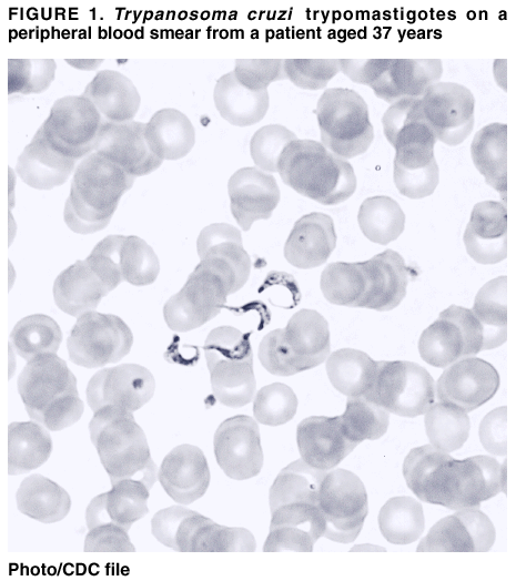 Persons using assistive technology might not be able to fully access information in this file. For assistance, please send e-mail to: mmwrq@cdc.gov. Type 508 Accommodation and the title of the report in the subject line of e-mail. Chagas Disease After Organ Transplantation --- United States, 2001Chagas disease (American trypanosomiasis) is caused by the protozoan parasite Trypanosoma cruzi. Chagas disease following solid-organ transplantation has occurred in Latin America, where Chagas disease is endemic, but has not been reported previously in the United States. This report describes three cases in the United States of T. cruzi infection associated with transplantation of organs from a single donor. CDC and the U.S. organ transplantation organizations will consider whether to recommend screening of potential donors for T. cruzi infection and, if so, which donors to screen, how to screen, and what to do if the screening tests are positive. On April 23, 2001, a physician notified CDC of an acute case of Chagas disease. A woman aged 37 years who had received cadaveric kidney and pancreas transplants on March 5 returned to the hospital on April 19 for evaluation of a febrile illness. On April 23, T. cruzi trypomastigotes were identified on a peripheral blood smear (Figure 1). Subsequently, two other persons who had received organs from the same donor---a woman aged 32 years who had received the liver and a woman aged 69 years who had received the other kidney---were found to be infected with T. cruzi. Cultures of blood from all three recipients were positive for T. cruzi. The donor, an immigrant from Central America, presumably had been infected with T. cruzi; however, no specimens from the donor were available for testing. After infection was detected, the recipients were treated with nifurtimox provided by the CDC Drug Service, which provides U.S.-licensed physicians with drugs that otherwise would not be available in the United States. The woman aged 69 years who had received a kidney was treated for approximately 4 months and, as of March 2002, has done well with no evidence of recurrence of T. cruzi infection. The other two patients died. The recipient of the kidney and pancreas transplants, who was the most immunosuppressed of the three patients, experienced recurrent, symptomatic T. cruzi parasitemia several weeks after completing a 4-month course of treatment with nifurtimox. On October 8, she died of acute Chagasic myocarditis, 2 weeks into her second course of nifurtimox therapy. On July 8, after several weeks of nifurtimox therapy, the recipient of the liver died of sepsis and hepatic and renal failure, which were unrelated to T. cruzi infection. Reported by: CF Zayas, MD, C Perlino, MD, A Caliendo, MD, D Jackson, MT(ASCP), EJ Martinez, MD, P Tso, MD, TG Heffron, MD, Emory Univ School of Medicine, Atlanta, Georgia. JL Logan, MD, Univ of Arizona College of Medicine, Tucson. BL Herwaldt, MD, AC Moore, MD, FJ Steurer, MS, C Bern, MD, JH Maguire, MD, Div of Parasitic Diseases, National Center for Infectious Diseases, CDC. Editorial Note:Chagas disease is endemic in parts of Central and South America and Mexico, where an estimated 16--18 million persons are infected with T. cruzi (1). An estimated 25,000--100,000 Latin American immigrants living in the United States are infected with T. cruzi (2). In nature, T. cruzi is transmitted when mucous membranes or breaks in the skin are contaminated with the feces of infected triatomine bugs. Congenital infection and transmission by blood transfusion and organ transplantation also occur. In humans, the acute phase of vectorborne T. cruzi infection lasts for weeks to months and typically is asymptomatic or associated with fever and other mild, nonspecific manifestations. However, life-threatening myocarditis or meningoencephalitis can occur during the acute phase, particularly in young children and immunocompromised persons. After years to decades of subclinical infection, 10%--30% of infected persons develop chronic Chagas disease, which is characterized by potentially lethal cardiomyopathy or megasyndromes (i.e., megaesophagus and megacolon) (1). Even persons who remain asymptomatic probably are infected and infectious for life, with low levels of the parasite in blood and other tissues. During the acute phase of infection, diagnosis involves detection of circulating organisms by microscopic examination of a fresh blood specimen or stained blood smear, hemoculture, or xenodiagnosis (1). Thereafter, diagnosis typically involves serologic testing because the level of parasitemia is too low to be detectable on blood smears. Hemoculture and xenodiagnosis can be positive, and polymerase chain reaction is a promising investigational technique for detecting low-level parasitemia (3). To decrease the risk for morbidity and mortality, infected persons should be treated as early in the course of infection as possible with either benznidazole (not available in the United States) or nifurtimox (available through the CDC Drug Service, telephone [404] 639-3670). Transmission of T. cruzi infection by solid-organ transplantation (particularly renal transplants) has been reported in Latin America (4--9), where serologic screening of organ donors and recipients for antibody to T. cruzi is standard practice. In two instances, both recipients of a kidney from the same donor became infected with T. cruzi (8,9). The cluster of three cases reported here represents the first recognized U.S. occurrence of T. cruzi infection through solid-organ transplantation. In the United States, no policies concerning the screening of potential organ donors for T. cruzi infection have been established. Although serologic tests for the diagnosis of T. cruzi infection are available in the United States, the tests vary in sensitivity and specificity. No test has been licensed in the United States for screening organ or blood donors. CDC has notified the United Network for Organ Shar