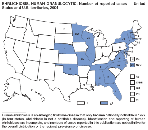 PrefaceThe Summary of Notifiable Diseases --- United States, 2004 contains the official statistics, in tabular and graphic form, for the reported occurrence of nationally notifiable infectious diseases in the United States for 2004. Unless otherwise noted, the data are final totals for 2004 reported as of December 2, 2005. These statistics are collected and compiled from reports sent by state health departments to the National Notifiable Diseases Surveillance System (NNDSS), which is operated by CDC in collaboration with the Council of State and Territorial Epidemiologists (CSTE). The Summary is available at http://www.cdc.gov/mmwr/summary.html. This site also includes publications from previous years. The Highlights section presents noteworthy epidemiologic and prevention information for 2004 for selected diseases and additional information to aid in the interpretation of surveillance and disease-trend data. Part 1 contains tables showing incidence data for the nationally notifiable diseases during 2004.* The tables provide the number of cases reported to CDC for 2004 nationwide as well as the distribution of cases by geographic location and the patient's demographic characteristics (age, sex, race, and ethnicity). Part 2 contains graphs and maps that depict summary data for certain notifiable diseases described in tabular form in Part 1. The Selected Reading section presents general and disease-specific references for notifiable infectious diseases. These references provide additional information on surveillance and epidemiologic concerns, diagnostic concerns, and disease-control activities. Comments and suggestions from readers are welcome. To increase the usefulness of future editions, comments about the current report and descriptions about how information is or could be used are invited. Comments should be sent to Public Health Surveillance Team --- NNDSS, National Center for Public Health Informatics at soib@cdc.gov. * Because no cases of anthrax; diphtheria; influenza-associated pediatric mortality; paralytic poliomyelitis; rubella, congenital syndrome; severe acute respiratory syndrome--associated coronavirus (SARS-CoV) disease; smallpox; vancomycin-intermediate Staphylococcus aureus; western equine encephalitis; or yellow fever were reported in the United States during 2004, these diseases do not appear in the tables in Part 1. For certain other nationally notifiable diseases, incidence data were reported to CDC but are not included in the tables or graphs of this Summary. Data on chronic hepatitis B and hepatitis C virus infection (past or present) are undergoing data quality review. Data on ehrlichiosis attributable to other or unspecified agents are being withheld from publication pending the outcome of discussions about the reclassification of certain Ehrlichia species, which will probably affect how data in this category are reported. Data on human immunodeficiency virus (HIV) infections are not included because HIV infection (not acquired immunodeficiency syndrome [AIDS]) reporting has been implemented on different dates and by using different methods than for AIDS case reporting; however, these data are summarized in the Highlights section. BackgroundThe infectious diseases designated as notifiable at the national level during 2004 are listed on page 3. A notifiable disease is one for which regular, frequent, and timely information regarding individual cases is considered necessary for the prevention and control of the disease. A brief history of the reporting of nationally notifiable infectious diseases in the United States is available at http://www.cdc.gov/epo/dphsi/nndsshis.htm. In 1961, CDC assumed responsibility for the collection and publication of data on nationally notifiable diseases. NNDSS is neither a single surveillance system nor a method of reporting. Certain NNDSS data are reported to CDC through separate surveillance information systems and through different reporting mechanisms; however, these data are aggregated and compiled for publication purposes. The list of nationally notifiable diseases is revised periodically. A disease might be added to the list as a new pathogen emerges, or a disease might be deleted as its incidence declines. Public health officials at state health departments and CDC collaborate in determining which diseases should be nationally notifiable. CSTE, with input from CDC, makes recommendations annually for additions and deletions. Although disease reporting is mandated by legislation or regulation at the state and local levels, state reporting to CDC is voluntary. Thus, the list of diseases considered notifiable varies slightly by state. Current and historic national public health surveillance case definitions used for classifying and enumerating cases consistently across reporting jurisdictions are available at http://www.cdc.gov/epo/dphsi/nndsshis.htm. All states report conditions that were designated as internationally quarantinable and notifiable (i.e., cholera, plague, and yellow fever) in compliance with the International Health Regulations (IHR) issued by the World Health Organization (WHO). In May 2005, the World Health Assembly adopted revised IHR. The current IHR will be replaced by the 2005 IHR when it becomes official on June 15, 2007, unless an earlier implementation date is adopted. The 2005 IHR revision stipulates that smallpox, poliomyelitis caused by wild-type poliovirus, human influenza caused by a new subtype, and SARS-CoV are directly reportable to WHO. In addition, the 2005 IHR includes an open-ended algorithm to determine which other conditions or events require mandatory reporting to WHO because they might constitute a public health emergency of international concern. Conditions that use the algorithm to determine notifiability include, but are not limited to, cholera, pneumonic plague, yellow fever, and West Nile fever (1). 1. World Health Organization. Third report of Committee A. Annex 2. Available at ht