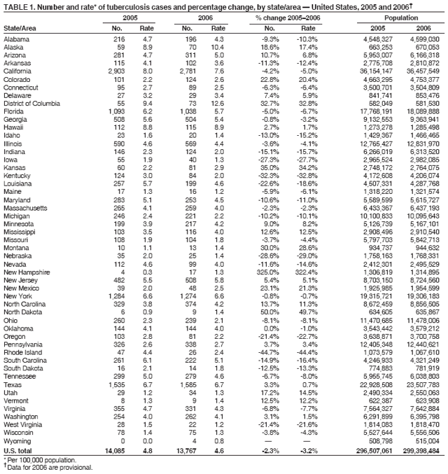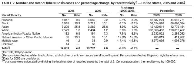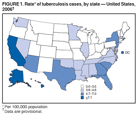 Persons using assistive technology might not be able to fully access information in this file. For assistance, please send e-mail to: mmwrq@cdc.gov. Type 508 Accommodation and the title of the report in the subject line of e-mail. Trends in Tuberculosis Incidence --- United States, 2006In 2006, a total of 13,767 tuberculosis (TB) cases (4.6 per 100,000 population) were reported in the United States, representing a 3.2% decline from the 2005 rate. This report summarizes provisional 2006 TB incidence data from the National TB Surveillance System and describes trends since 1993. The TB rate in 2006 was the lowest recorded since national reporting began in 1953, but the rate of decline has slowed since 2000. The average annual percentage decline in the TB incidence rate decreased from 7.3% per year during 1993--2000 (95% confidence interval [CI] = 6.9%--7.8%) to 3.8% during 2000--2006 (CI = 3.1%--4.5%). Foreign-born persons and racial/ethnic minority populations continue to be affected disproportionately by TB in the United States. In 2006, the TB rate among foreign-born persons in the United States was 9.5 times that of U.S.-born persons.* The TB rates among blacks, Asians, and Hispanics were 8.4, 21.2, and 7.6 times higher than rates among whites, respectively. The slowing of the decline in the overall national TB rate and the inability to effectively address persistent disparities in TB rates between U.S.-born and foreign-born persons and between whites and racial/ethnic minority populations threaten progress toward the goal of eliminating TB in the United States. In 1989, CDC and the Advisory Committee for the Elimination of Tuberculosis issued a strategic plan for the elimination of TB, setting an interim target case rate of 3.5 per 100,000 population by 2000 and ultimately the elimination of TB (i.e., <1 case per 1 million population) in the United States by 2010 (1). TB is a nationally notifiable disease. Health departments in the 50 states and District of Columbia (DC) electronically report to CDC any TB cases that meet the CDC and Council of State and Territorial Epidemiologists case definition.§ Reports include the patient's race, ethnicity (i.e., Hispanic or non-Hispanic), treatment information, and drug-susceptibility test results if available. For this analysis, CDC calculated national and state TB rates (2) and rates for foreign-born and U.S.-born persons (3) and racial/ethnic populations (4) by using current U.S. census population estimates for the years 1993 through 2006. In 2006, TB incidence rates in the 51 reporting areas ranged from 0.8 (Wyoming) to 12.6 (DC) cases per 100,000 population (median: 3.4 cases). Thirty states had lower rates in 2006 than 2005; 20 states and DC had higher rates (Table 1). In 2006, for the second consecutive year and the second time since national reporting began, approximately half of states (26 of 50) had TB rates of <3.5 per 100,000 (Figure 1); however, 11 of those 26 states had higher rates of TB in 2006 than in 2005. Seven states (California, Florida, Georgia, Illinois, New Jersey, New York, and Texas) reported more than 500 cases each for 2006; combined, these seven states accounted for 60% (8,259) of all TB cases. Among U.S.-born persons, the number and rate of TB cases continued to decline in 2006. The U.S.-born TB rate was 2.3 per 100,000 population (5,924 or 43.3% of all cases with known origin of birth), representing a 7.0% decline in rate since 2005 and a 68.6% decline since 1993 (Figure 2). Among foreign-born persons, the number of TB cases increased in 2006, but the rate decreased. The foreign-born TB rate in 2006 was 21.9 per 100,000 population, representing a 0.5% decline in rate since 2006 and a 35.8% decline since 1993. As the rate of decline in TB cases among foreign-born persons lagged behind the decline in TB cases among U.S.-born persons, the foreign-born to U.S.-born rate ratio increased 7.0%, from 8.9 in 2005 to 9.5 in 2006. In 2006, approximately half (55.6%) of TB cases among foreign-born persons were reported in persons from five countries: Mexico (1,912), the Philippines (856), Vietnam (630), India (540), and China (376). In 2006, for the third consecutive year, more TB cases were reported among Hispanics than any other racial/ethnic population. Among persons with TB whose country of birth was known, 95.6% (3,126 of 3,269) of Asians, 74.7% (3,024 of 4,050) of Hispanics, 29.9% (1,110 of 3,712) of blacks, and 17.8% (427 of 2,404) of whites were foreign born. From 2005 to 2006, TB rates declined for all racial/ethnic minorities except American Indians/Alaska Natives and Native Hawaiians or Other Pacific Islanders¶ (Table 2). Human immunodeficiency virus (HIV) contributes to the TB pandemic because immune suppression increases the likelihood of rapid progression from TB infection to TB disease. From 2005 to 2006, among TB cases with HIV status reported,** the percentage of TB cases with HIV infection decreased 4.4% (from 13.0% to 12.4%), but the percentage of TB cases with unknown HIV status increased 10.3% (from 28.7% to 31.7%). The decline in the percentage of TB cases with HIV infection might reflect incomplete reporting of HIV test results attributed to a lack of HIV testing or HIV reporting. A total of 124 cases of multidrug-resistant TB (MDR TB)§§ were reported in 2005, the most recent year for which complete drug-susceptibility data are available.¶¶ The proportion of MDR-TB cases remained constant at 1.2% from 2004 (129 of 10,846 TB cases) to 2005 (124 of 10,662). In 2005, MDR TB continued to disproportionately affect foreign-born persons, who accounted for 101 (81.5%) of 124 MDR-TB cases. The recommended length of drug therapy for most types of TB is 6--9 months. In 2003, the latest year for which treatment data are complete, 82.7% of patients for whom <1 year of treatment was indicated completed therapy within 1 year, below the Healthy People 2010 target of 90% (objective 14-12). Reported by: R Pratt, V Ro