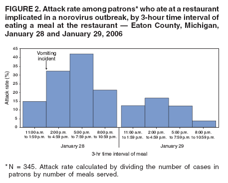 A total of 281 patrons in whom cases were identified had dined on January 28, resulting in an attack rate of 33.7%; on January 29, the attack rate was 13.5% (64 cases divided by 475 meals). Analysis of patron illness based on date and time that the meal was eaten demonstrated that norovirus transmission was occurring in the restaurant before the vomiting incident on January 28 (Figure 2). The attack rate was highest for patrons who ate during 5:00 p.m.--7:59 p.m. on January 28. Transmission continued through the next day.