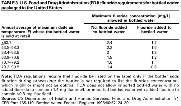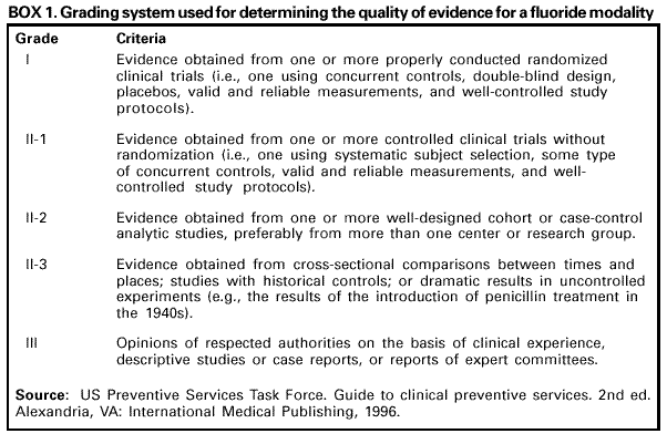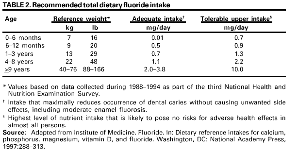 Persons using assistive technology might not be able to fully access information in this file. For assistance, please send e-mail to: mmwrq@cdc.gov. Type 508 Accommodation and the title of the report in the subject line of e-mail. Recommendations for Using Fluoride to Prevent and Control Dental Caries in the United StatesFluoride Recommendations Work Group Steven M. Adair, D.D.S., M.S. School of Dentistry Medical College of Georgia Augusta, Georgia William H. Bowen, Ph.D. Caries Research Center University of Rochester Rochester, New York Brian A. Burt, B.D.S., M.P.H., Ph.D. School of Public Health University of Michigan Ann Arbor, Michigan Jayanth V. Kumar, D.D.S., M.P.H. New York Department of Health Albany, New York Steven M. Levy, D.D.S., M.P.H. College of Dentistry University of Iowa Iowa City, Iowa David G. Pendrys, D.D.S., Ph.D. School of Dental Medicine University of Connecticut Farmington, Connecticut R. Gary Rozier, D.D.S., M.P.H. School of Public Health University of North Carolina Chapel Hill, North Carolina Robert H. Selwitz, D.D.S., M.P.H. National Institute of Dental and Craniofacial Research Bethesda, Maryland John W. Stamm, D.D.S., D.D.P.H. School of Dentistry University of North Carolina Chapel Hill, North Carolina George K. Stookey, Ph.D., D.D.S. School of Dentistry Indiana University Indianapolis, Indiana Gary M. Whitford, Ph.D., D.M.D. School of Dentistry Medical College of Georgia Augusta, Georgia Fluoride Recommendations Reviewers Myron Allukian, Jr., D.D.S., M.P.H. Director of Oral Health Boston Public Health Commission Boston, Massachusetts John P. Brown, B.D.S., Ph.D. Department of Community Dentistry University of Texas Health Science Center San Antonio, Texas Joseph A. Ciardi, Ph.D. National Institute of Dental and Craniofacial Research Bethesda, Maryland D. Christopher Clark, D.D.S., M.P.H. Faculty of Dentistry University of British Columbia North Vancouver, Canada Stephen B. Corbin, D.D.S., M.P.H. Oral Health America Brookeville, Maryland Michael W. Easley, D.D.S., M.P.H. School of Dental Medicine State University of New York Buffalo, New York Caswell A. Evans, D.D.S., M.P.H. County Dental Director Los Angeles, California Lawrence J. Furman, D.D.S., M.P.H. National Institute of Dental and Craniofacial Research Bethesda, Maryland Stanley B. Heifetz, D.D.S., M.P.H. Department of Dental Medicine and Public Health School of Dentistry University of Southern California Los Angeles, California Keith E. Heller, D.D.S., Dr.P.H. School of Public Health University of Michigan Ann Arbor, Michigan Amid I. Ismail, D.D.S., Dr.P.H. School of Dentistry University of Michigan Ann Arbor, Michigan David W. Johnston, B.D.S., M.P.H. School of Dentistry University of Western Ontario London, Canada John V. Kelsey, D.D.S., M.B.A. US Food and Drug Administration Rockville, Maryland James A. Lalumandier, D.D.S., M.P.H. School of Dentistry Case Western Reserve University Hudson, Ohio Stephen J. Moss, D.D.S., M.S. College of Dentistry New York University New York, New York Ernest Newbrun, D.M.D., Ph.D. School of Dentistry University of California, San Francisco San Francisco, California Kathy R. Phipps, Dr.P.H. School of Dentistry Oregon Health Sciences University Portland, Oregon Mel L. Ringelberg, D.D.S., Dr.P.H. State Dental Director State of Florida Department of Health Tallahassee, Florida Jay D. Shulman, D.M.D., M.S.P.H. Baylor College of Dentistry Dallas, Texas Phillip A. Swango, D.D.S., M.P.H. Private dental consultant Albuquerque, New Mexico Gerald R. Vogel, Ph.D. ADA Health Foundation Paffenbarger Research Center Gaithersburg, Maryland James S. Wefel, Ph.D. College of Dentistry University of Iowa Iowa City, Iowa B. Alex White, D.D.S., Dr.P.H. Kaiser-Permanente, Inc. Portland, Oregon Summary Widespread use of fluoride has been a major factor in the decline in the prevalence and severity of dental caries (i.e., tooth decay) in the United States and other economically developed countries. When used appropriately, fluoride is both safe and effective in preventing and controlling dental caries. All U.S. residents are likely exposed to some degree to fluoride, which is available from multiple sources. Both health-care professionals and the public have sought guidance on selecting the best way to provide and receive fluoride. During the late 1990s, CDC convened a work group to develop recommendations for using fluoride to prevent and control dental caries in the United States. This report includes these recommendations, as well as a) critical analysis of the scientific evidence regarding the efficacy and effectiveness of fluoride modalities in preventing and controlling dental caries, b) ordinal grading of the quality of the evidence, and c) assessment of the strength of each recommendation. Because frequent exposure to small amounts of fluoride each day will best reduce the risk for dental caries in all age groups, the work group recommends that all persons drink water with an optimal fluoride concentration and brush their teeth twice daily with fluoride toothpaste. For persons at high risk for dental caries, additional fluoride measures might be needed. Measured use of fluoride modalities is particularly appropriate during the time of anterior tooth enamel development (i.e., age <6 years). The recommendations in this report guide dental and other health-care providers, public health officials, policy makers, and the public in the use of fluoride to achieve maximum protection against dental caries while using resources efficiently and reducing the likelihood of enamel fluorosis. The recommendations address public health and professional practice, self-care, consumer product industries and health agencies, and further research. Adoption of these recommendations could further reduce dental caries in the United States and save public and private resources. INTRODUCTIONDental caries (i.e., tooth decay) is an infectious, multifactorial disease afflicting most persons in industrialized cou