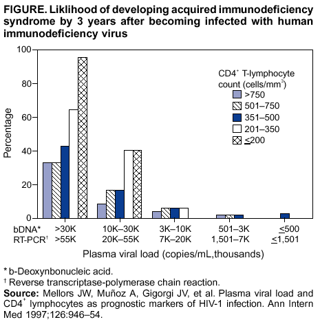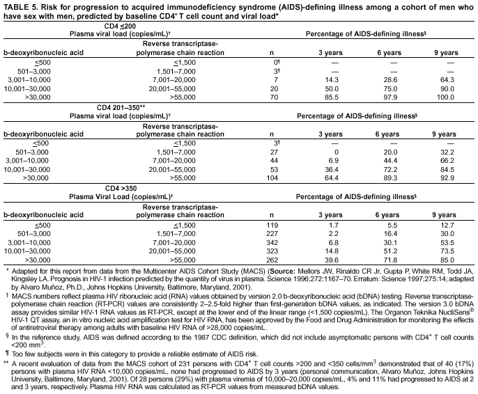 Observational cohorts have provided critical data regarding the prognostic influence of viral load and CD4+ T cell count in the absence of treatment. These data indicate a strong relationship between plasma HIV RNA levels and CD4+ T cell counts in terms of risk for progression to AIDS for untreated persons and provide potent support for the conclusion that therapy should be initiated before the CD4+ T cell count declines to <200 cells/mm3 (Figure; Tables 4,5). In addition, these studies are useful for the identification of asymptomatic persons at high risk who have CD4+ T cell counts >200 cells/mm3 and who might be candidates for antiretroviral therapy or more frequent CD4+ T cell count monitoring. Regarding CD4+ T cell count monitoring, the Multicenter AIDS Cohort Study (MACS) demonstrated that the 3-year risk for progression to AIDS was 38.5% among patients with 201--350 CD4+ T cells/mm3, compared with 14.3% for patients with CD4+ T cell counts >350 cells/mm3. However, the short-term risk for progression also was related to the level of plasma HIV RNA, and the risk was relatively low for those persons with <20,000 copies/mL. An evaluation of 231 persons with CD4+ T cell counts of 201--350 cells/mm3 demonstrated that the 3-year risk for progression to AIDS was 4.1% for the 74 patients with HIV RNA <20,000; 36.4% for those 53 patients with HIV RNA 20,001--55,000 copies/mL; and 64.4% for those 104 patients with HIV RNA >55,000 copies/mL. Similar risk gradations by viral load were evident for patients with CD4+ T cell counts >350 cells/mm3 (Figure; Table 5) (unpublished data, Alvaro Muñoz, Ph.D., Johns Hopkins University, Baltimore, Maryland, 2001). These data indicate that for certain patients with CD4+ T cell counts >200 cells/mm3, the 3-year risk for disease progression to AIDS in the absence of treatment is substantially increased. Thus, although observational studies of untreated persons cannot assess the effects of therapy and, therefore, cannot determine the optimal time to initiate therapy, these studies do provide key guidance regarding the risks for progression in the absence of therapy on the basis of a patient's CD4+ T cell count and viral load.