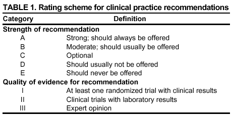 Each recommendation is accompanied by a rating that includes a letter and a Roman numeral (Table 1) and is similar to the rating schemes used in previous guidelines concerning prophylaxis of opportunistic infections (OIs) issued by the U.S. Public Health Service and the Infectious Diseases Society of America (2). The letter indicates the strength of the recommendation, which is based on the opinion of the Panel, and the Roman numeral reflects the nature of the evidence supporting the recommendation (Table 1). Thus, recommendations made on the basis of data from clinical trials with clinical results are differentiated from those made on the basis of laboratory results (e.g., CD4+ T lymphocyte count or plasma HIV ribonucleic acid [RNA] levels). When clinical trial data are unavailable, recommendations are made on the basis of the opinions of persons experienced in the treatment of HIV infection and familiar with the relevant literature.