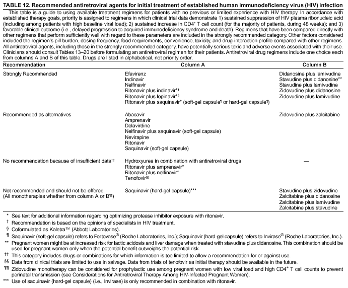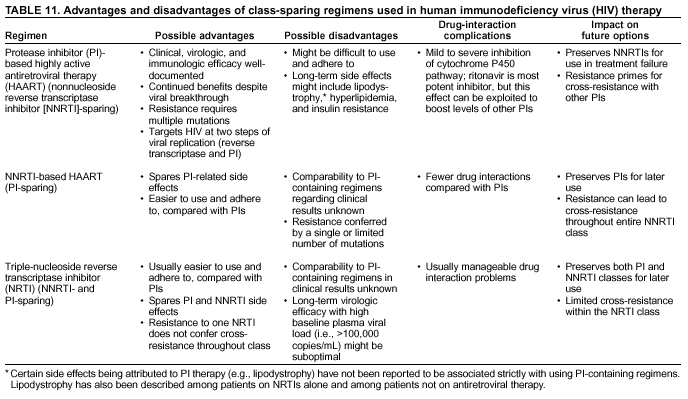 Another tool for maximizing benefits of antiretroviral therapy is the rational sequencing of drugs and the preservation of future treatment options for as long as possible. Three alternative regimens include a protease inhibitor (PI) with two nucleoside reverse transcriptase inhibitors (NRTIs), a nonnucleoside reverse transcriptase inhibitor (NNRTI) with two NRTIs, or a 3-NRTI regimen (Table 11). The goal of a class-sparing regimen is to preserve or spare >1 classes of drugs for later use. Extending the overall long-term effectiveness of the available therapy options might be possible by sequencing drugs in this manner. Moreover, this strategy enables selectively delaying the risk for certain side effects associated with a single class of drugs. The efficacy of PI-containing HAART regimens has been reported to include durable viral load suppression, partial immunologic restoration, and decreased incidence of AIDS and death (24--26). Viral load suppression and CD4+ T cell responses that are similar to those observed with PI-containing regimens have been achieved with selected PI-sparing regimens (e.g., efavirenz plus two NRTIs [107] or abacavir plus two NRTIs [108]); however, whether such PI-sparing regimens will provide comparable efficacy with regard to clinical outcomes is unknown.