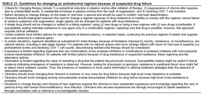 Treatment goals should be maximal and durable suppression of viral load, restoration and preservation of immunologic function, improvement of quality of life, and reduction of HIV-related morbidity and mortality. Results of therapy are evaluated through plasma HIV RNA levels, which are expected to indicate a 1.0 log10 decrease at 2--8 weeks and no detectable virus (<50 copies/mL) at 4--6 months after treatment initiation. Failure of therapy at 4--6 months might be ascribed to nonadherence, inadequate potency of drugs or suboptimal levels of antiretroviral agents, viral resistance, and other factors that are poorly understood. Patients whose therapy fails in spite of a high level of adherence to the regimen should have their regimen changed; this change should be guided by a thorough drug treatment history and the results of drug-resistance testing. Because of limitations in the available alternative antiretroviral regimens that have documented efficacy, optimal changes in therapy might be difficult to achieve for patients in whom the preferred regimen has failed. These decisions are further confounded by problems with adherence, toxicity, and resistance. For certain patients, participating in a clinical trial with or without access to new drugs or using a regimen that might not achieve complete suppression of viral replication might be preferable. Because concepts regarding HIV management are evolving rapidly, readers should check regularly for additional information and updates at the HIV/AIDS Treatment Information Service website (http://www.hivatis.org).