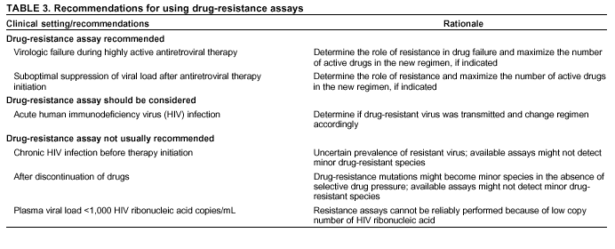 Resistance assays can be useful for patients experiencing virologic failure while on antiretroviral therapy and patients with acute HIV infection (Table 3). Recent prospective data supporting drug-resistance testing in clinical practice are derived from trials in which the test utility was assessed for cases of virologic failure. Two studies compared virologic responses to antiretroviral treatment regimens when genotyping resistance tests were available to guide therapy (10,11) with the responses observed when changes in therapy were guided by clinical judgment only. The results of both studies indicated that the short-term virologic response to therapy was substantially increased when results of resistance testing were available. Similarly, a prospective, randomized, multicenter trial demonstrated that therapy selected on the basis of phenotypic resistance testing substantially improves the virologic response to antiretroviral therapy, compared with therapy selected without the aid of phenotypic testing (12). Thus, resistance testing appears to be a useful tool in selecting active drugs when changing antiretroviral regimens in cases of virologic failure (BII). Similar rationale applies to the potential use of resistance testing for patients with suboptimal viral load reduction (see Criteria for Changing Therapy) (BIII). Virologic failure regarding highly active antiretroviral therapy (HAART) is, for certain patients, associated with resistance to one component of the regimen only (13); in that situation, substituting individual drugs in a failing regimen might be possible, although this concept requires clinical validation (see Changing a Failing Regimen). No prospective data exist to support using one type of resistance assay over another (i.e., genotyping versus phenotyping) in different clinical situations. Therefore, one type of assay is recommended per sample; however, for patients with a complex treatment history, both assays might provide critical and complementary information.