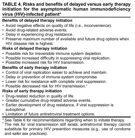 In addition to the risks for disease progression, the decision to initiate antiretroviral therapy also is influenced by an assessment of other potential risks and benefits associated with treatment. Potential benefits and risks of early or delayed therapy initiation for the asymptomatic patient should be considered by the clinician and patient (Table 5). Potential benefits of early therapy include 1) earlier suppression of viral replication; 2) preservation of immune function; 3) prolongation of disease-free survival; and 4) decrease in the risk for viral transmission. Risks include 1) the adverse effects of the drugs on quality of life; 2) the inconvenience of the majority of the available suppressive regimens, leading to reduced adherence; 3) development of drug resistance because of suboptimal suppression of viral replication; 4) limitation of future treatment options as a result of premature cycling of the patient through the available drugs; 5) the risk for transmission of virus resistant to antiretroviral drugs; 6) serious toxicities associated with certain antiretroviral drugs (e.g., elevations in serum levels of cholesterol and triglycerides, alterations in the distribution of body fat, or insulin resistance and diabetes mellitus); and 7) the unknown durability of effect of available therapies. Potential benefits of delayed therapy include 1) minimization of treatment-related negative effects on quality of life and drug-related toxicities; 2) preservation of treatment options; and 3) delay in the development of drug resistance. Potential risks of delayed therapy include 1) the possibility that damage to the immune system, which might otherwise be salvaged by earlier therapy, is irreversible; 2) the possibility that suppression of viral replication might be more difficult at a later stage of disease; and 3) the increased risk for HIV transmission to others during a longer untreated period. Finally, for certain persons, ascertaining the precise time at which the CD4+ T cell count will decrease to a level where the risk for disease is high might be difficult, and time might be required to identify an effective, tolerable regimen. This task might be better accomplished before reaching a CD4+ T cell count of 200 cells/mm3.