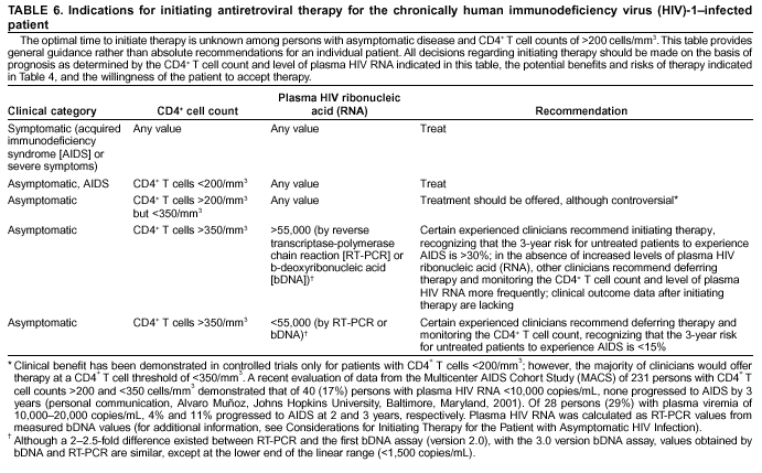 Antiretroviral regimens are complex, have serious side effects, pose difficulty with adherence, and carry serious potential consequences from the development of viral resistance because of nonadherence to the drug regimen or suboptimal levels of antiretroviral agents. Patient education and involvement in therapeutic decisions is critical. Treatment should usually be offered to all patients with symptoms ascribed to HIV infection. Recommendations for offering antiretroviral therapy among asymptomatic patients require analysis of real and potential risks and benefits. Treatment should be offered to persons who have <350 CD4+ T cells/mm3 or plasma HIV ribonucleic acid (RNA) levels of >55,000 copies/mL (by b-deoxyribonucleic acid [bDNA] or reverse transcriptase-polymerase chain reaction [RT-PCR] assays). The recommendation to treat asymptomatic patients should be based on the willingness and readiness of the person to begin therapy; the degree of existing immunodeficiency as determined by the CD4+ T cell count; the risk for disease progression as determined by the CD4+ T cell count and level of plasma HIV RNA; the potential benefits and risks of initiating therapy in an asymptomatic person; and the likelihood, after counseling and education, of adherence to the prescribed treatment regimen.