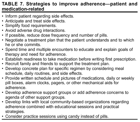 The first principle of patient-related strategies is to negotiate a treatment plan that the patient understands and to which he or she commits (Tables 7--10) (64,65). Before writing the first prescription, clinicians should assess the patient's readiness to take medication, which might take two or three office visits and patience. Patient education should include the goals of therapy, including a review of expected outcomes that are based on baseline viral load and CD4+ T cell counts (e.g., MACS data from the Guidelines [4]), the reason for adherence, and the plan for and mechanics of adherence. Patients must understand that the first HAART regimen has the best chance for long-term success (1). Clinicians and health teams should develop a plan for the specific regimen, including how medication timing relates to meals and daily routines. Centers have offered practice sessions and have used candy in place of pills to familiarize the patient with the rigors of HAART; however, no data exist to indicate if this exercise improves adherence. Daily or weekly pillboxes, timers with alarms, pagers, and other devices can be useful. Because medication side effects can affect treatment adherence, clinicians should inform patients in advance of possible side effects and when they are likely to occur. Treatment for side effects should be included with the first prescription, as well as instructions on appropriate response to side effects and when to contact the clinician. Low literacy is associated with suboptimal adherence, also. Clinicians should assess a patient's literacy level before relying on written information, and they should tailor the adherence intervention for each patient. Visual aids and audio or video information sources can be useful for patients with low literacy (66).