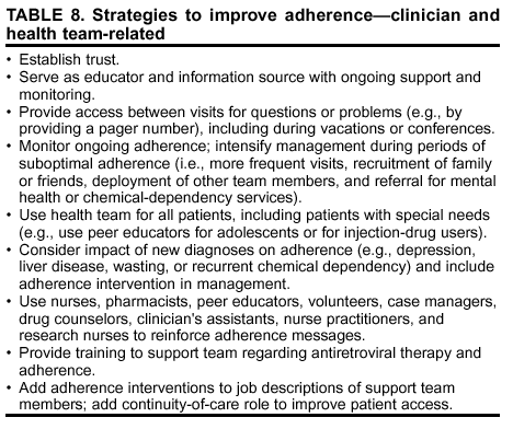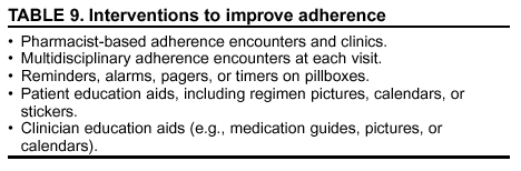 Optimal adherence requires full participation by the health-care team, with goal reinforcement by >2 team members. Supportive and nonjudgmental attitudes and behaviors will encourage patient honesty regarding adherence and problems. Improved adherence is associated with interventions that include pharmacist-based adherence clinics (69), street-level drop-in centers with medication storage and flexible hours for homeless persons (70), adolescent-specific training programs (71), and medication counseling and behavioral interventions (72) (Table 9). For all health-care team members, specific training regarding HAART and adherence should be offered and updated periodically.