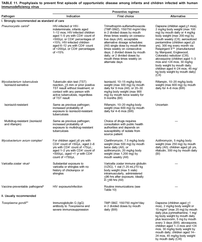 11. Table 11 Dosages for prophylaxis to prevent first episode of opportunistic disease among HIV-infected infants and children;