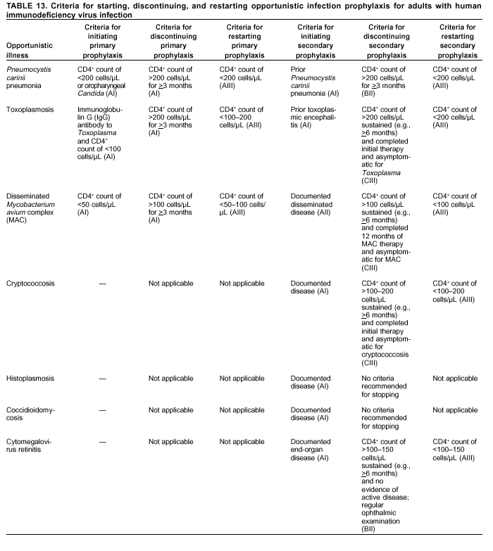 For recommendations regarding discontinuing chemoprophylaxis, readers will note that criteria vary by such factors as duration of CD4+ T lymphocyte count increase, and, in the case of secondary prophylaxis, duration of treatment of the initial episode of disease. These differences reflect the criteria used in specific studies. Therefore, certain inconsistencies in the format of these criteria are unavoidable.