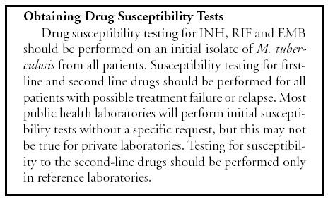Patients suspected of having tuberculosis should have appropriate specimens collected for microscopic examination and mycobacterial culture. When the lung is the site of disease, three sputum specimens should be obtained. Sputum induction with hypertonic saline may be necessary to obtain specimens and bronchoscopy (both performed under appropriate infection control measures) may be considered for patients who are unable to produce sputum, depending on the clinical circumstances. Susceptibility testing for INH, RIF, and EMB should be performed on a positive initial culture, regardless of the source of the specimen. Second-line drug susceptibility testing should be done only in reference laboratories and be limited to specimens from patients who have had prior therapy, who are contacts of patients with drug-resistant tuberculosis, who have demonstrated resistance to rifampin or to other first-line drugs, or who have positive cultures after more than 3 months of treatment.