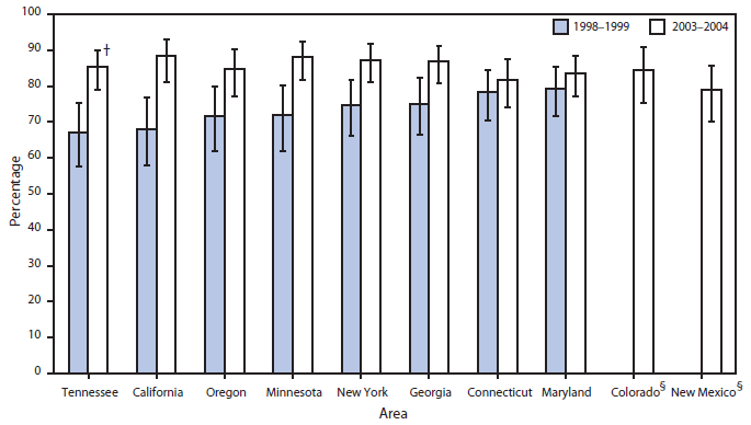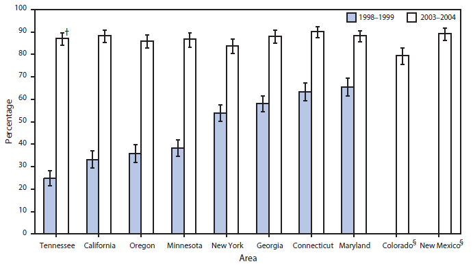 FIGURE 2. Percentage of pregnant women screened for group B streptococcal colonization --- Active Bacterial Core surveillance areas, 1998--1999 and 2003--2004*