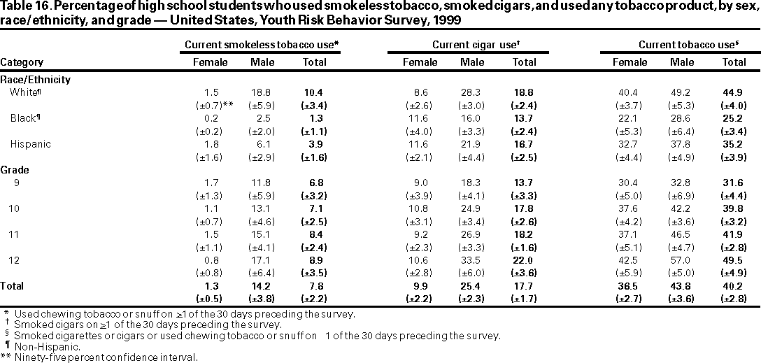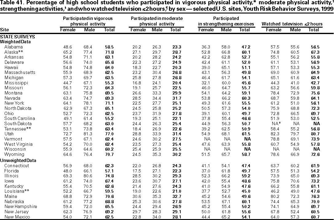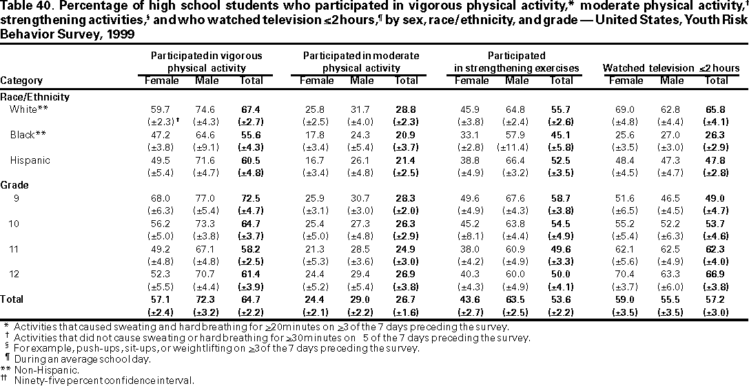 Among adults aged >25 years, two thirds of all deaths in the United States result from cardiovascular disease (42%) and cancer (24%) (1). Leading causes of mortality and morbidity among all age groups in the United States are related to the following six categories of health behavior: behaviors that contribute to unintentional and intentional injuries; tobacco use; alcohol and other drug use; sexual behaviors that contribute to unintended pregnancy and STDs, including human immunodeficiency virus (HIV) infection; unhealthy dietary behaviors; and physical inactivity. These behaviors are frequently interrelated and often are established during youth and extend into adulthood.