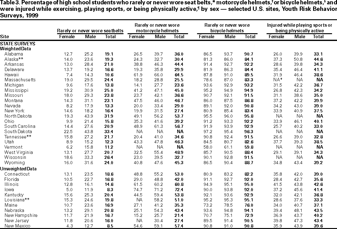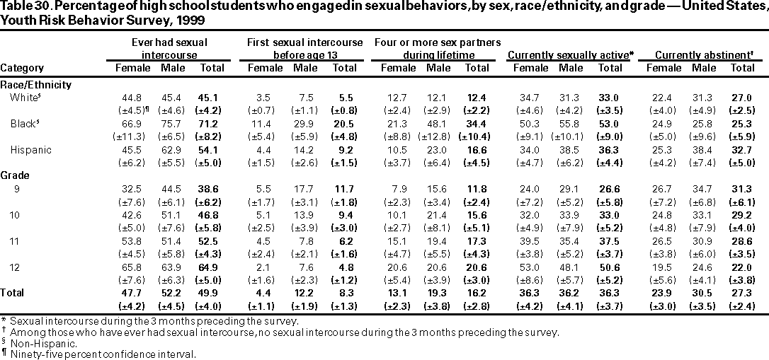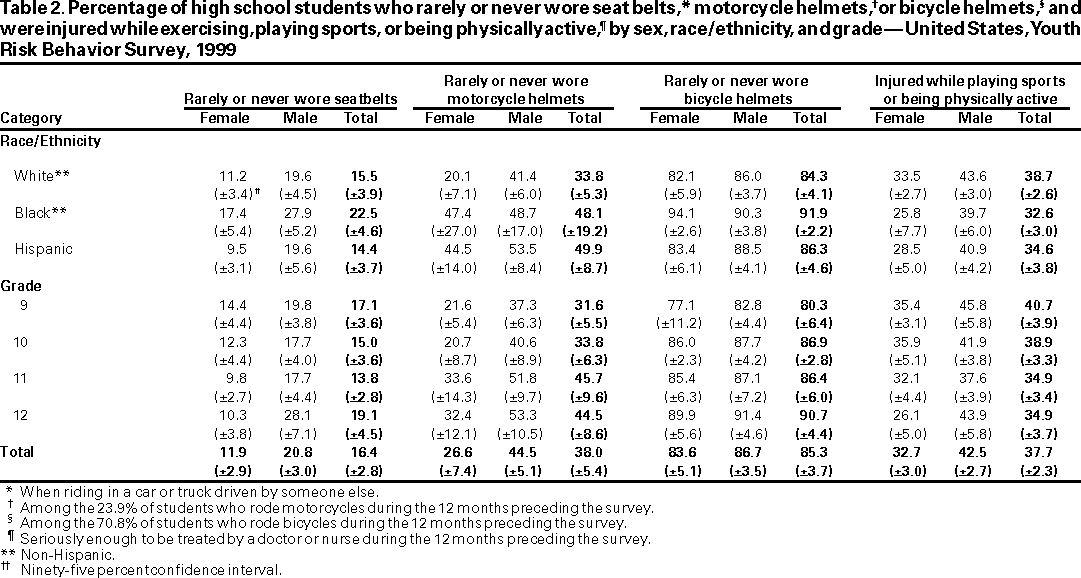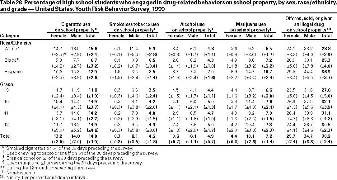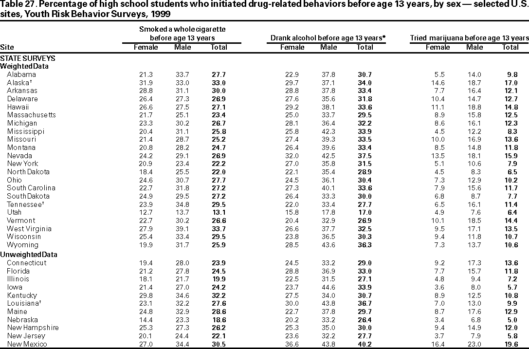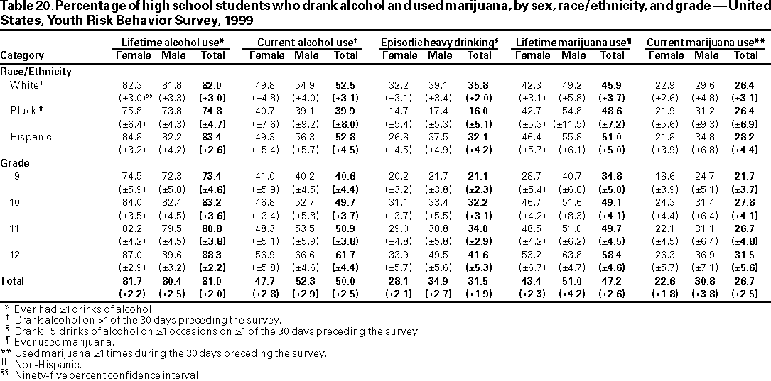 Results and Interpretation: In the United States, approximately three fourths of all deaths among persons aged 10--24 years result from only four causes: motor-vehicle crashes, other unintentional injuries, homicide, and suicide. Results from the 1999 national Youth Risk Behavior Survey demonstrate that numerous high school students engage in behaviors that increase their likelihood of death from these four causes --- 16.4% had rarely or never worn a seat belt; during the 30 days preceding the survey, 33.1% had ridden with a driver who had been drinking alcohol; 17.3% had carried a weapon during the 30 days preceding the survey; 50.0% had drunk alcohol during the 30 days preceding the survey; 26.7% had used marijuana during the 30 days preceding the survey; and 7.8% had attempted suicide during the 12 months preceding the survey. Substantial morbidity and social problems among young persons also result from unintended pregnancies and STDs, including HIV infection. In 1999, nationwide, 49.9% of high school students had ever had sexual intercourse; 42.0% of sexually active students had not used a condom at last sexual intercourse; and 1.8% had ever injected an illegal drug. Two thirds of all deaths among persons aged >25 years result from only two causes --- cardiovascular disease and cancer. The majority of risk behaviors associated with these two causes of death are initiated during adolescence. In 1999, 34.8% of high school students had smoked cigarettes during the 30 days preceding the survey; 76.1% had not eaten >5 servings/day of fruits and vegetables during the 7 days preceding the survey; 16.0% were at risk for becoming overweight; and 70.9% did not attend physical education class daily.