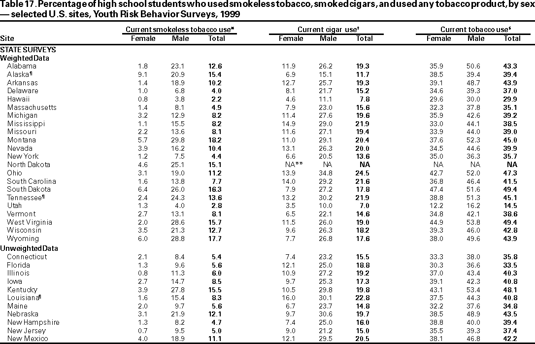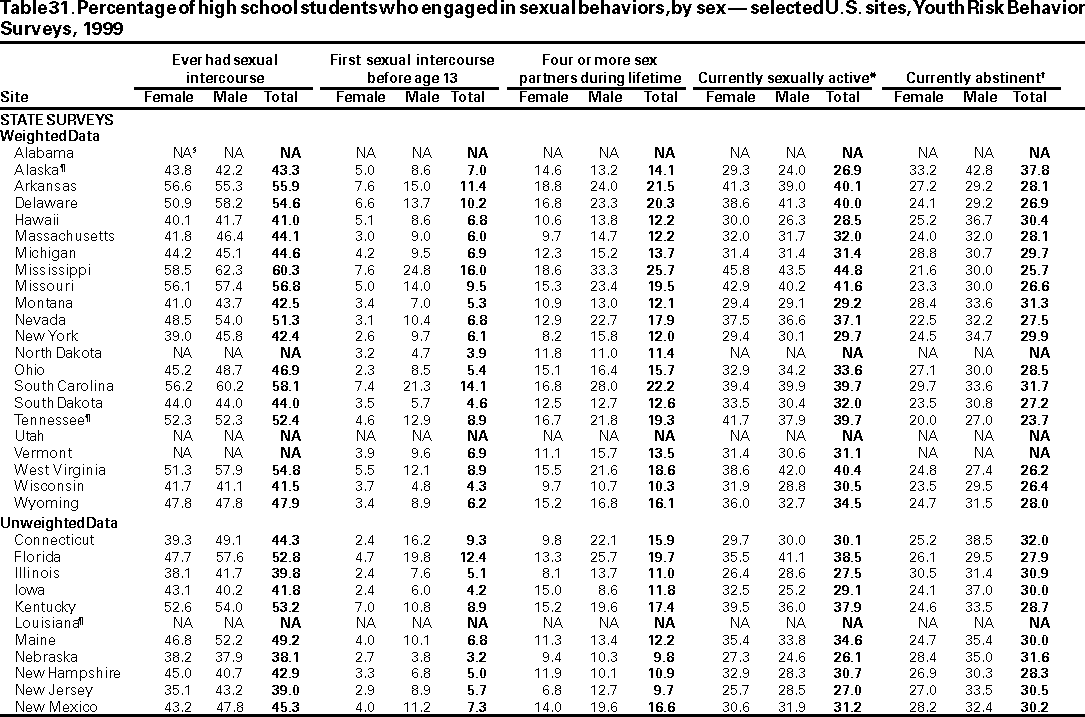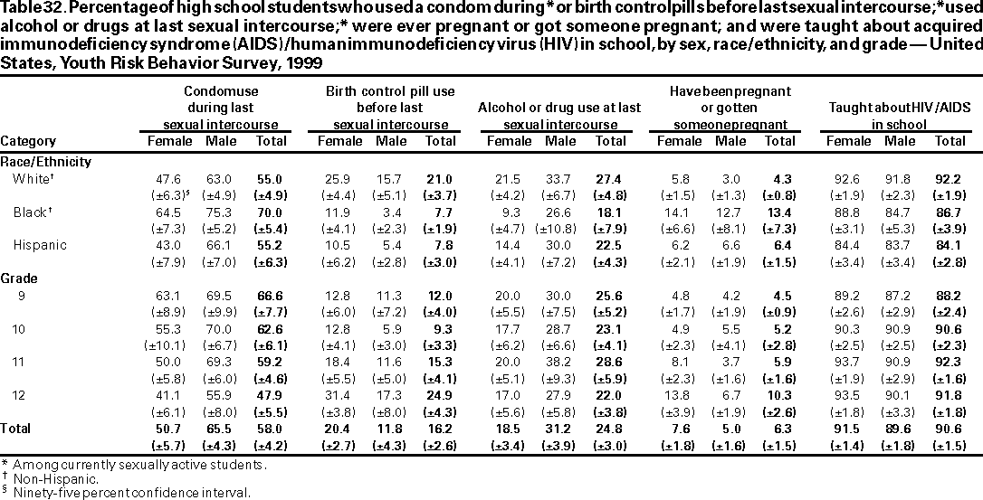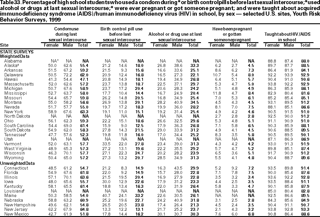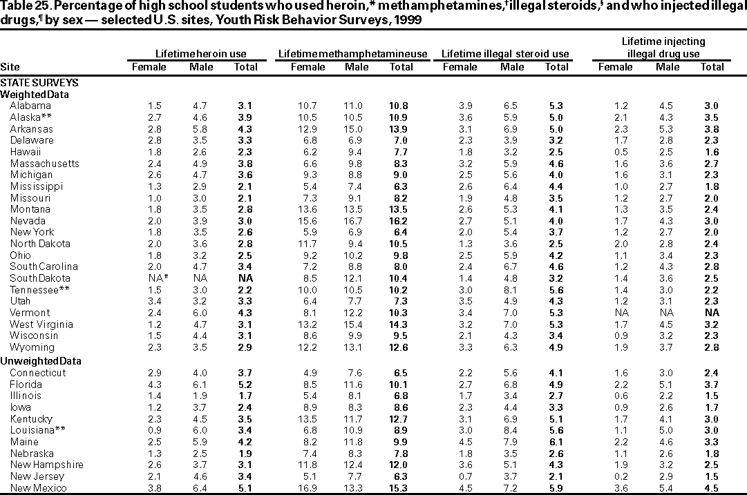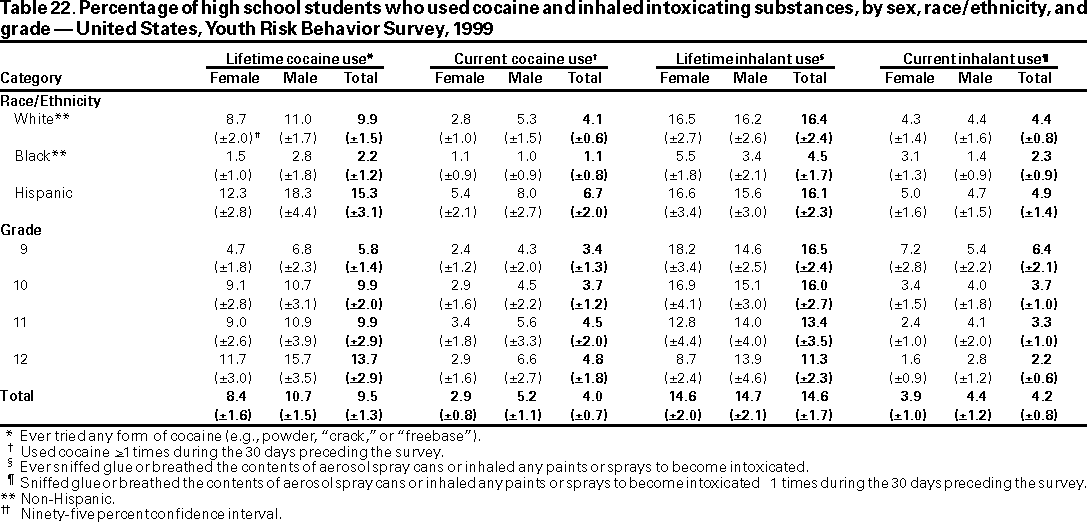 Results and Interpretation: In the United States, approximately three fourths of all deaths among persons aged 10--24 years result from only four causes: motor-vehicle crashes, other unintentional injuries, homicide, and suicide. Results from the 1999 national Youth Risk Behavior Survey demonstrate that numerous high school students engage in behaviors that increase their likelihood of death from these four causes --- 16.4% had rarely or never worn a seat belt; during the 30 days preceding the survey, 33.1% had ridden with a driver who had been drinking alcohol; 17.3% had carried a weapon during the 30 days preceding the survey; 50.0% had drunk alcohol during the 30 days preceding the survey; 26.7% had used marijuana during the 30 days preceding the survey; and 7.8% had attempted suicide during the 12 months preceding the survey. Substantial morbidity and social problems among young persons also result from unintended pregnancies and STDs, including HIV infection. In 1999, nationwide, 49.9% of high school students had ever had sexual intercourse; 42.0% of sexually active students had not used a condom at last sexual intercourse; and 1.8% had ever injected an illegal drug. Two thirds of all deaths among persons aged >25 years result from only two causes --- cardiovascular disease and cancer. The majority of risk behaviors associated with these two causes of death are initiated during adolescence. In 1999, 34.8% of high school students had smoked cigarettes during the 30 days preceding the survey; 76.1% had not eaten >5 servings/day of fruits and vegetables during the 7 days preceding the survey; 16.0% were at risk for becoming overweight; and 70.9% did not attend physical education class daily.