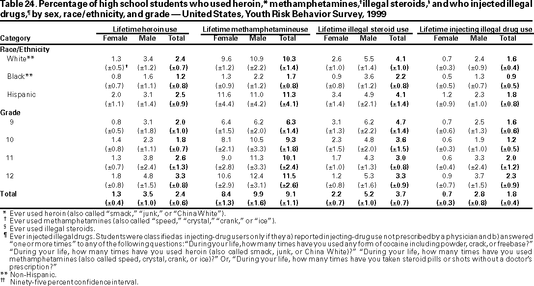 ***** Students were classified as injecting-drug users only if they a) reported injecting-drug use not prescribed by a physician and b) answered one or more times to any of the following questions: