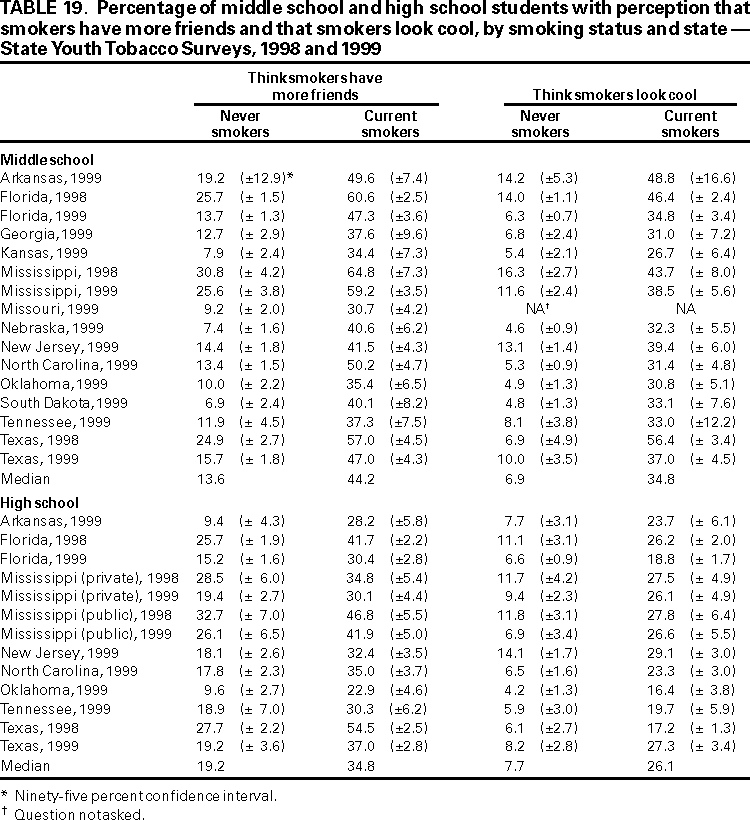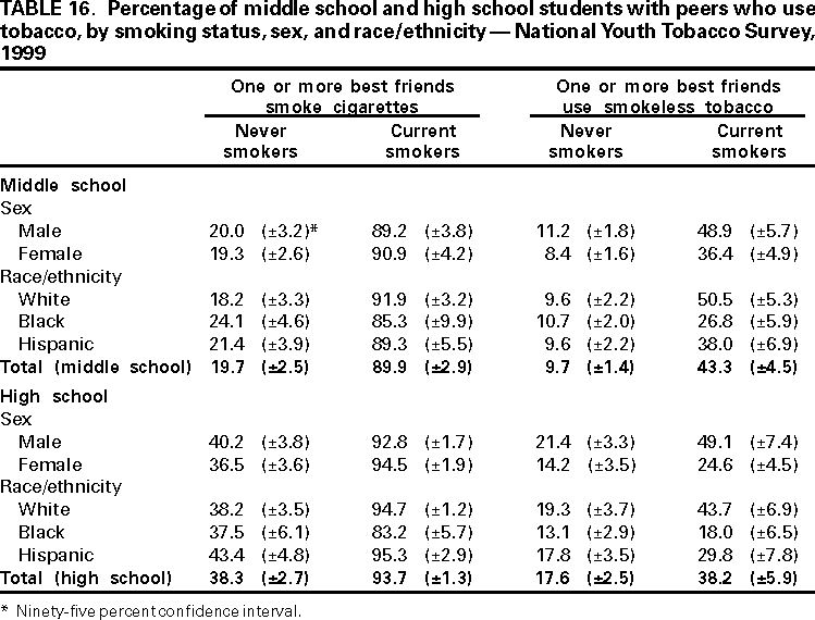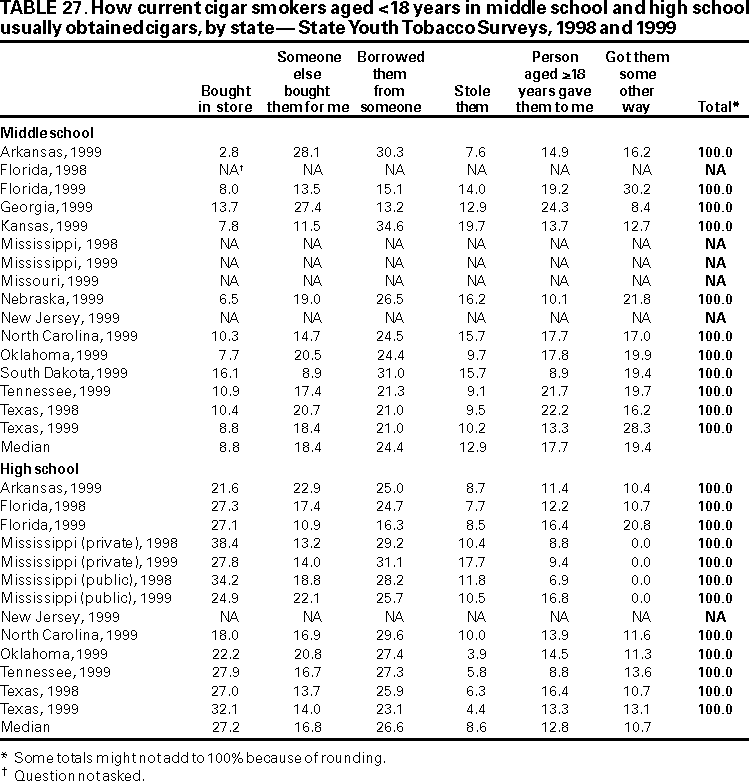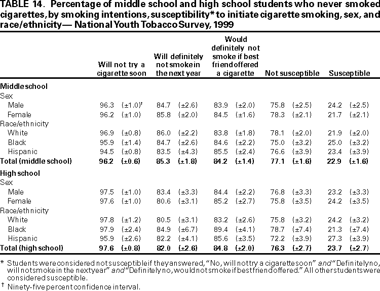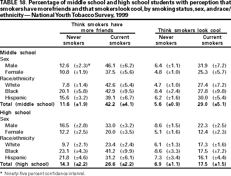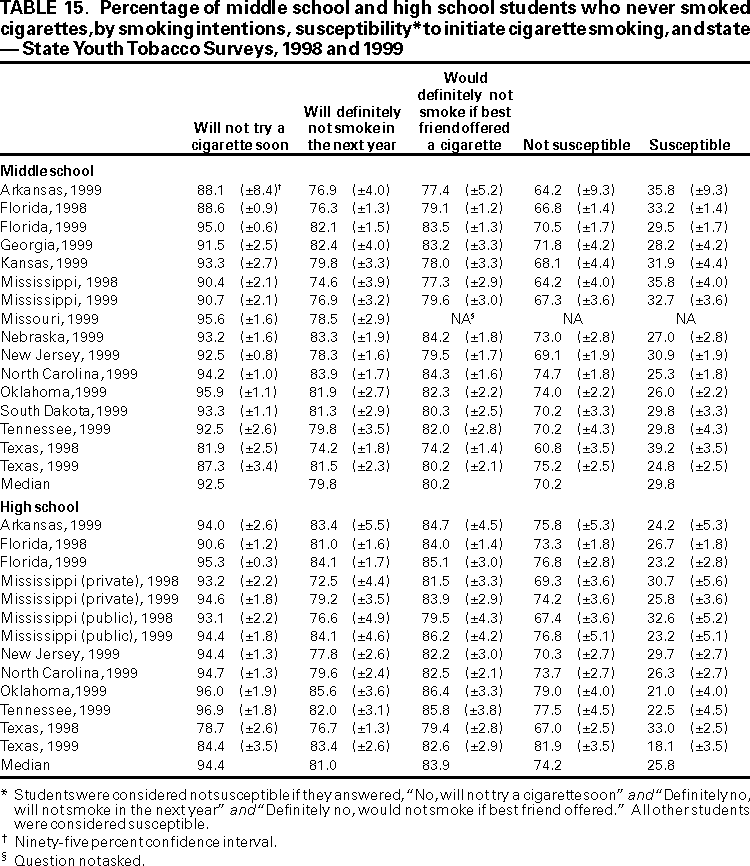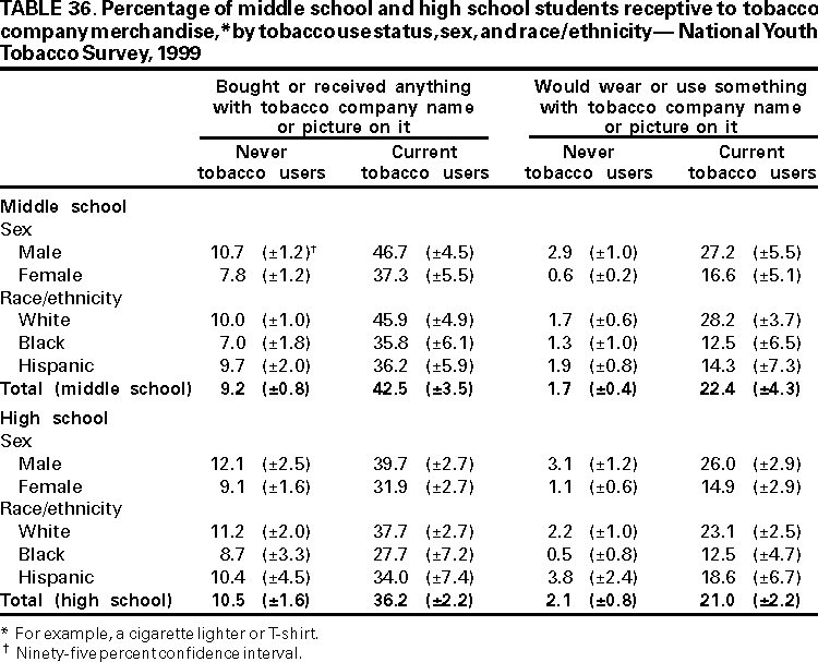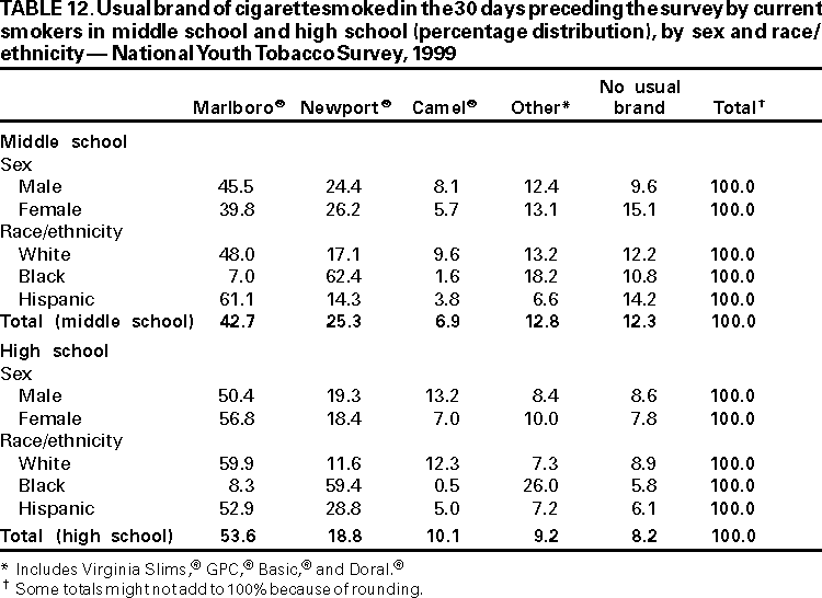 Office on Smoking and Health, National Center for Chronic Disease Prevention and Health Promotion American Legacy Foundation, Washington, DC CDC Foundation, Atlanta, Georgia Macro International, Calverton, Maryland State Youth Tobacco Survey Coordinators AbstractProblem/Condition: Tobacco use is the single leading preventable cause of death in the United States, accounting for approximately 430,000 deaths each year. The prevalence of cigarette smoking nationwide among high school students increased during the 1990s, peaking in 1996--1997, then began a gradual decline. Approximately 80% of tobacco users initiate use before the age of 18 years. If the trend in early initiation of cigarette smoking continues, approximately 5 million children aged <18 years who are living today will die prematurely as adults because they began to smoke cigarettes during adolescence. The economic liability associated with tobacco use ranges from $50 billion to $73 billion per year in medical expenses alone. Because of these health and economic consequences, CDC has recommended that states establish and maintain comprehensive tobacco control programs to reduce tobacco use among youth. Reporting Period: February 1998 through December 1999. Description of the System: To assist states in developing and maintaining their state-based comprehensive tobacco prevention and control programs, CDC developed the Youth Tobacco Surveillance and Evaluation System, which includes international, national, and state school-based surveys of middle school and high school students. Two components of this system are discussed --- the National Youth Tobacco Survey and the state Youth Tobacco Surveys. The national survey is representative of students in the 50 states and the District of Columbia; 15,061 students in 131 schools completed questionnaires in 1999. The state surveys were first conducted in 1998, when three states participated, and in 1999, when 13 states participated (13 states conducted middle school surveys and 10 states conducted high school surveys); state sample sizes ranged from 452 to 15,478 students. This report summarizes data from the 1999 national survey and the 1998 and 1999 state surveys. Results and Interpretation: Findings from the National Youth Tobacco Survey show current tobacco use ranges from 12.8% among middle school students to 34.8% among high school students. Cigarette smoking is the most prevalent form of tobacco used, followed by cigars and smokeless tobacco. Young people have strong cigarette brand preferences. Almost half of current smokers in both middle school and high school report that they usually smoke Marlboro® cigarettes. Black students are more likely to smoke Newport® cigarettes than any other brand. Half of current smokers in middle school and high school report that they want to completely stop smoking. Nearly one fourth of middle school and high school students who have never smoked cigarettes indicate that they are susceptible to initiating smoking in the next year. Environmental tobacco smoke exposure is very high among both middle school and high school students. During the week before the survey, approximately 9 out of 10 current smokers and half of never smokers were in the same room with someone who was smoking; 8 out of 10 current smokers and 3 out of 10 never smokers rode in a car with someone who was smoking. Six out of 10 current smokers and 3 out of 10 never smokers live in a home where someone else smokes cigarettes. Approximately 70% of middle school and 60% of high school students who currently smoke and are aged <18 years were not asked to show proof of age when they purchased cigarettes. Approximately three fourths of middle school and high school students have seen antismoking commercials; however, 90% report having seen actors smoking on television or in the movies. Approximately 2% of middle school and high school students who had never used tobacco would wear or use something with a tobacco company name or picture on it. This rate increases to approximately 20% for current tobacco users. Actions Taken: Youth Tobacco Survey data are used by health and education officials to improve national and state programs to prevent and control youth tobacco use. Many states also use the data in presentations to their state legislators to demonstrate the need for increased funding for smoking cessation and prevention programs for youth. INTRODUCTIONTobacco use is the single leading preventable cause of death in the United States (1), accounting for approximately 430,000 deaths each year (2). The prevalence of cigarette smoking nationwide among high school students increased during the 1990s (3), peaking in 1996--1997, and then began a gradual decline (4). Approximately 80% of tobacco users initiate use before the age of 18 years (5). If the trend in early initiation of cigarette smoking continues, approximately 5 million children aged <18 years who are living today will die prematurely as adults because they began to smoke cigarettes during adolescence (2). The economic liability associated with tobacco use ranges from $50 billion to $73 billion per year in medical expenses alone (6). CDC recommends that states establish and maintain comprehensive tobacco control programs to reduce tobacco use among youth (6). Surveillance and evaluation are among the primary elements of a comprehensive tobacco control program. To assist states in developing and maintaining their surveillance and evaluation systems, CDC developed the Youth Tobacco Surveillance and Evaluation System, which includes international, national, and state school-based surveys of middle school and high school students. Two components of this system are the National Youth Tobacco Survey (NYTS) and the state Youth Tobacco Surveys (YTS). The YTS and NYTS were developed to provide states with the data necessary to support the design, implementation, and evaluation of a comprehensive tobacco control program. Many states