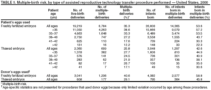 Persons using assistive technology might not be able to fully access information in this file. For assistance, please send e-mail to: mmwrq@cdc.gov. Type 508 Accommodation and the title of the report in the subject line of e-mail. Assisted Reproductive Technology Surveillance --- United States, 2000Please note: An erratum has been published for this article. To view the erratum, please click here. Victoria C. Wright, M.P.H. Abstract Problem/Condition: In 1996, CDC initiated data collection regarding assisted reproductive technology (ART) procedures performed in the United States to determine medical center-specific pregnancy success rates, as mandated by the Fertility Clinic Success Rate and Certification Act (FCSRCA) (Public Law 102-493, October 24, 1992). ART includes fertility treatments in which both eggs and sperm are handled in the laboratory (i.e., in vitro fertilization and related procedures). Patients who undergo ART treatments are more likely to deliver multiple-birth infants than women who conceive naturally. Multiple births are associated with increased risk for mothers and infants (e.g., pregnancy complications, premature delivery, low-birthweight infants, and long-term disability among infants). Reporting Period Covered: 2000. Description of System: CDC contracts with a professional society, the Society for Assisted Reproductive Technology (SART), to obtain data from fertility medical centers located in the United States. Since 1997, CDC has compiled data related to ART procedures. The Assisted Reproductive Technology Surveillance System was initiated by CDC in collaboration with the American Society for Reproductive Medicine, the Society for Assisted Reproductive Technology, and RESOLVE: The National Infertility Association. Results: In 2000, a total of 25,228 live-birth deliveries and 35,025 infants resulting from 99,629 ART procedures were reported to CDC from 383 medical centers that performed ART in the United States and U.S. territories. Nationally, 75,516 (76%) of ART treatments were freshly fertilized embryos using the patient's eggs; 13,312 (13%) were thawed embryos using the patient's eggs; 7,919 (8%) were freshly fertilized embryos from donor eggs; and 2,882 (3%) were thawed embryos from donor eggs. The national live-birth delivery per transfer rate was 30.8%. The five states that reported the highest number of ART procedures were California (13,194), New York (11,239), Massachusetts (8,041), Illinois (7,323), and New Jersey (5,506). These five states also reported the highest number of live-birth deliveries and infants born as a result of ART. Overall, 47% of women undergoing ART-transfer procedures using freshly fertilized embryos from their own eggs were aged <35 years; 23% were aged 35--37 years; 19% were aged 38--40 years; 7% were aged 41--42 years; and 4% were aged >42 years. Among ART treatments in which freshly fertilized embryos from the patient's eggs were used, substantial variation in patient age, infertility diagnoses, history of past infertility treatment, and past births was observed. Nationally, live-birth rates were highest for women aged <35 years (38%). The risk for a multiple-birth delivery was highest for women who underwent ART-transfer procedures using freshly fertilized embryos from either donor eggs (40%) or from their own eggs (35%). Among women who underwent ART-transfer procedures using freshly fertilized embryos from their own eggs, further variation by patient age and number of embryos transferred was observed. Of the 35,025 infants born, 44% were twins, and 9% were triplet and higher order multiples, for a total multiple-infant birth rate of 53%. Patient's residing in states with the highest number of live-birth deliveries also reported the highest number of infants born in multiple-birth deliveries. Interpretation: Whether an ART procedure was successful (defined as resulting in a pregnancy and live-birth delivery) varied according to different patient and treatment factors. Patient factors included the age of the woman undergoing ART, whether she had previously given birth, whether she had previously undergone ART, and the infertility diagnosis of both the female and male partners. Treatment factors included whether eggs were from the patient or a woman serving as an egg donor, whether the embryos were freshly fertilized or previously frozen and thawed, how long the embryos were kept in culture, how many embryos were transferred, and whether various specialized treatment procedures were used in conjunction with ART. ART poses a major risk for multiple births. This risk varied according to the patient's age, the type of ART procedure performed, and the number of embryos transferred. In addition, the increased risk for multiple births has a notable population impact in certain states. Public Health Actions: As use of ART and ART success rates continue to increase, ART-related multiple births are an increasingly important public health problem nationally and in many states. The proportion of infants born through ART in 2000 that were multiple births (53%) was substantially higher than in the general U.S. population during the same period. Data in this report indicate a need to reduce multiple births associated with ART. Efforts should be made to limit the number of embryos transferred for patients undergoing ART. In addition, continued research and surveillance is key to understanding the effect of ART on maternal and child health. IntroductionFor >2 decades, assisted reproductive technologies (ARTs) have been used by couples to overcome infertility. ARTs include those infertility treatments in which both eggs and sperm are handled in the laboratory (i.e., in vitro fertilization and related procedures). Since the birth of the first U.S. infant conceived with ART in 1981, use of these treatments has increased dramatically. Each year, both the number of medical centers providing ART services and the total number of procedures performe