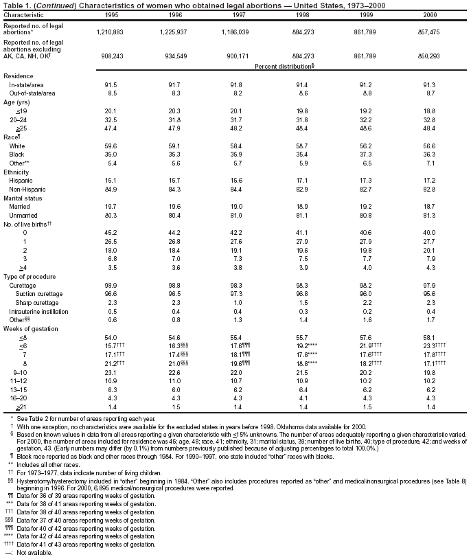 Persons using assistive technology might not be able to fully access information in this file. For assistance, please send e-mail to: mmwrq@cdc.gov. Type 508 Accommodation and the title of the report in the subject line of e-mail. Abortion Surveillance --- United States, 2000Laurie D. Elam-Evans, Ph.D. Abstract Problem/Condition: CDC began abortion surveillance in 1969 to document the number and characteristics of women obtaining legal induced abortions. Reporting Period Covered: This report summarizes and describes data reported to CDC regarding legal induced abortions obtained in the United States in 2000. Description of System: For each year since 1969, CDC has compiled abortion data by state or area of occurrence. During 1973--1997, data were received from or estimated for 52 reporting areas in the United States: 50 states, the District of Columbia, and New York City. In 1998 and 1999, CDC compiled abortion data from 48 reporting areas. Alaska, California, New Hampshire, and Oklahoma did not report, and data for these areas were not estimated. In 2000, Oklahoma again reported these data, increasing the number of reporting areas to 49. Results: A total of 857,475 legal induced abortions were reported to CDC for 2000 from 49 reporting areas, representing a 0.5% decrease from the 861,789 legal induced abortions reported by 48 reporting areas for 1999 and a 1.3% decrease for the same 48 reporting areas that reported in 1999. The abortion ratio, defined as the number of abortions per 1,000 live births, was 246 in 2000 (for the same 48 reporting areas as 1999), compared with 256 reported for 1999. This represents a 3.8% decline in the abortion ratio. The abortion rate (for the same 48 reporting areas as 1999) was 16 per 1,000 women aged 15--44 years for 2000. This was also a 3.8% decrease from the rate reported for procedures performed during 1997--1999 for the same 48 reporting areas. The highest percentages of reported abortions were for women aged <25 years (52%), women who were white (57%), and unmarried women (81%). Fifty-eight percent of all abortions for which gestational age was reported were performed at <8 weeks of gestation, and 88% were performed before 13 weeks. From 1992 (when detailed data regarding early abortions were first collected) through 2000, steady increases have occurred in the percentage of abortions performed at <6 weeks of gestation. Few abortions were performed after 15 weeks of gestation; 4.3% were obtained at 16--20 weeks and 1.4% were obtained at >21 weeks. A total of 31 reporting areas submitted data stating that they performed medical (nonsurgical) procedures, making up 1.0% of all reported procedures from the 42 areas with adequate reporting on type of procedure. In 1998 and 1999 (the most recent years for which data are available), 14 women died as a result of complications from known legal induced abortion. Ten of these deaths occurred in 1998 and four occurred in 1999; no deaths were associated with known illegal abortion. Interpretation: From 1990 through 1997, the number of legal induced abortions gradually declined. In 1998 and 1999, the number of abortions continued to decrease when comparing the same 48 reporting areas. In 2000, even with one additional reporting state, the number of abortions declined slightly. In 1998 and 1999, as in previous years, deaths related to legal induced abortions occurred rarely (<1 death per 100,000 abortions). Public Health Action: Abortion surveillance in the United States continues to provide data necessary for examining trends in numbers and characteristics of women who obtain legal induced abortions and for increasing understanding of one additional aspect of the spectrum of pregnancy outcomes. Policy makers and program planners need these data to improve the health and well-being of women and infants. IntroductionCDC began conducting abortion surveillance in 1969 to document the number and characteristics of women obtaining legal induced abortions and to monitor one outcome of unintended pregnancies. This report is based on abortion data for 2000 provided to CDC's National Center for Chronic Disease Prevention and Health Promotion (NCCDPHP), Division of Reproductive Health. MethodsFor 2000, CDC compiled data that were voluntarily provided from 49 reporting areas in the United States: 47 states (excluding Alaska, California, and New Hampshire), the District of Columbia, and New York City. Legal induced abortion was defined as a procedure, performed by a licensed physician or someone acting under the supervision of a licensed physician, that was intended to terminate a suspected or known intrauterine pregnancy and to produce a nonviable fetus at any gestational age (1,2). The total number of legal induced abortions was available from all reporting areas; however, not all of these areas collected data regarding some or all of the characteristics of women who obtained abortions. Thus, the availability of data on characteristics of women obtaining an abortion varied by reporting area in 2000. Most reporting areas (46 states, the District of Columbia, and New York City) collected and reported adequate data (i.e., data categorized in accordance with surveillance variables and with <15% unknown values) by age of the woman, whereas only 29 states, the District of Columbia, and New York City collected and reported adequate data by Hispanic ethnicity. Therefore, the findings in this report reflect characteristics of women only from reporting areas that submitted adequate data for the characteristics being examined. For the majority of state tables, the percentage data include a category for unknown values. However, for trend data, out-of-area residents, adolescent ages, and two-characteristics tables, percentages presented are based on known values only. For the 49 reporting areas, data concerning the number of women obtaining legal induced abortions were provided by the central health agency.* These agencies provided dat