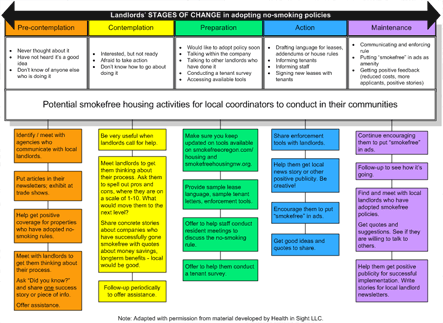 In addition, our model was adopted by the Oregon Tobacco Prevention and Education Program (TPEP), which initiated a new contract with Health In Sight LLC for coordinating smoke-free housing efforts at the state level. TPEP also requires grantees in all 36 counties in Oregon to work with property managers to adopt no-smoking policies. A schematic outlining activities to accomplish this, depicted in terms of a landlord’s stage of change, was developed as a tool for these county programs (Figure 2).