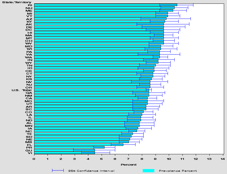 Adult Self-Reported Current Asthma Prevalence by State or Territory: BRFSS 2008