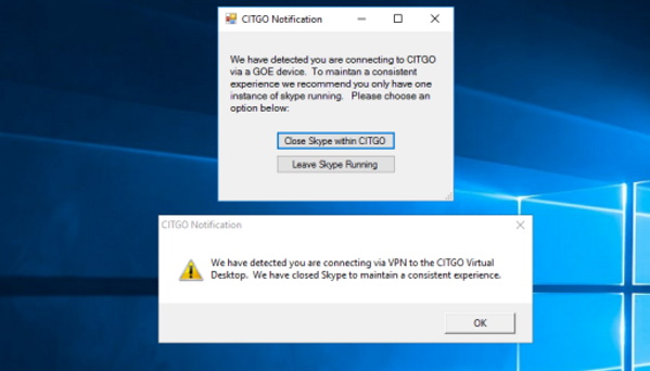 **It is recommended that you close out of Skype on your local machine before accessing CITGO and launching it in CITGO if that is where you want audio for Skype to work. You will get the prompts below if you have Skype running locally, please go into task manager on your local computer and close it: