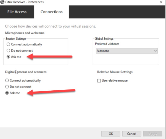 Microphones and webcams at the top and Digital cameras and scanners should be set to Ask me: