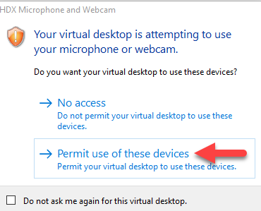 **Please do not select “Do not ask me again for this virtual deskop” unless you say Permit use of these devices.