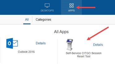 The Self-Service CITGO Session Reset Tool is found under the APPS icon at the top of the CITGO web portal. Click on the rest tool which will launch the tool.