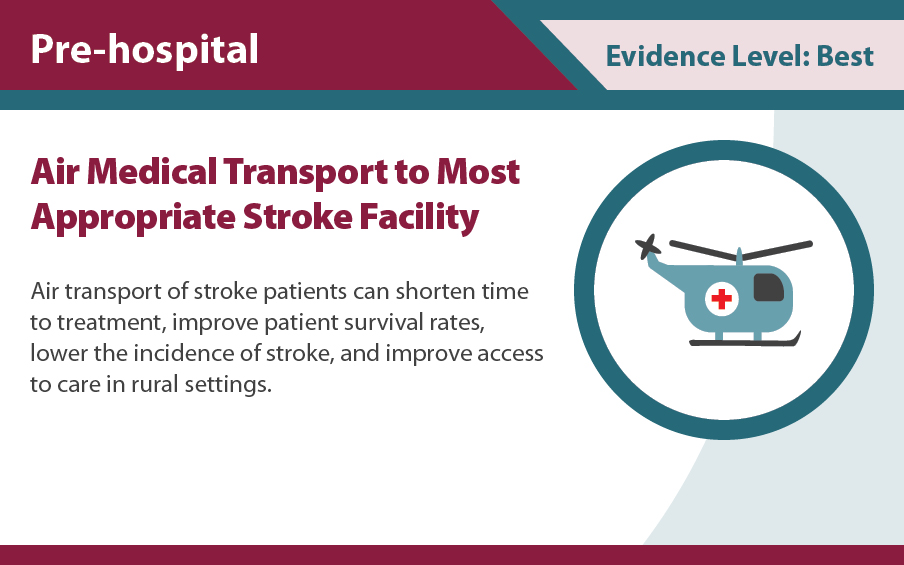In May 2017, the Centers for Disease Control and Prevention, Division for Heart Disease and Stroke Prevention (DHDSP) assessed the best available evidence for 7 policy interventions to improve pre-hospital stroke care; these interventions were addressed in state law. Pre-hospital stroke care includes all emergency medical care provided to the stroke patient before the handoff of the patient from EMS providers to staff at the acute care facility.