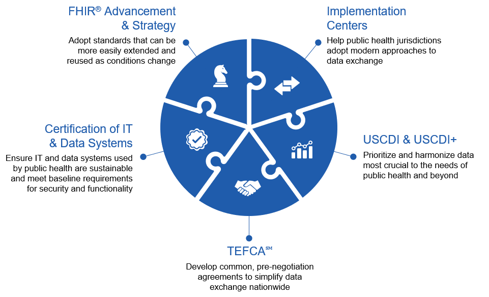 To accomplish these goals, CDC and Assistant Secretary of Technology Policy/Office of the National Coordinator for Health Information Technology (ASTP) jointly lead the federal efforts to address public health interoperability. Together, we provide the tools, support, and resources to ensure timely and secure sharing of data that is usable for public health action without unnecessary effort and complexity.