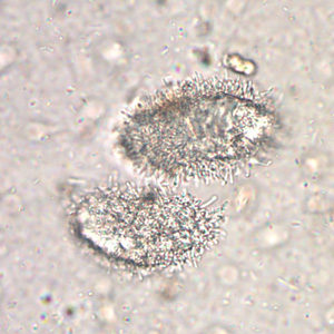 Figure A: Pollen grain in a concentrated wet mount of stool. This grain looks very similar to the fertile egg of Ascaris lumbricoides, although the spine-like structures on the outer layer should separate the two.